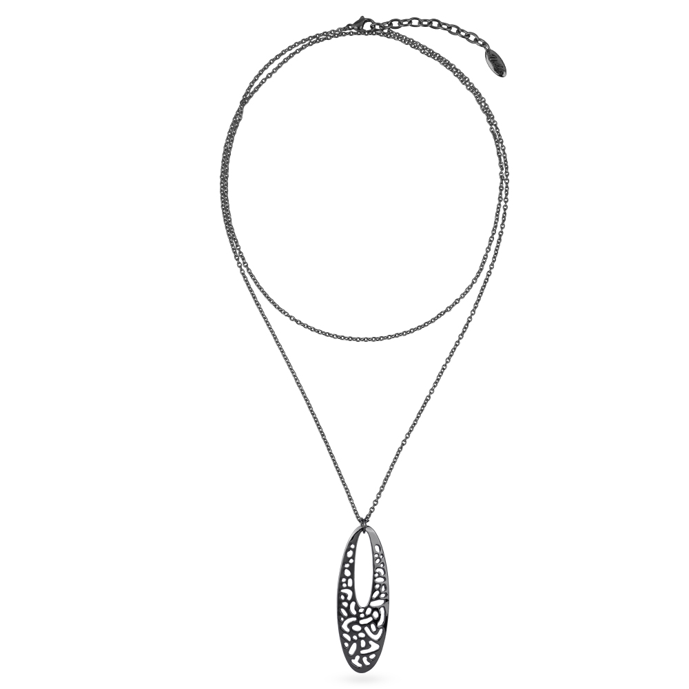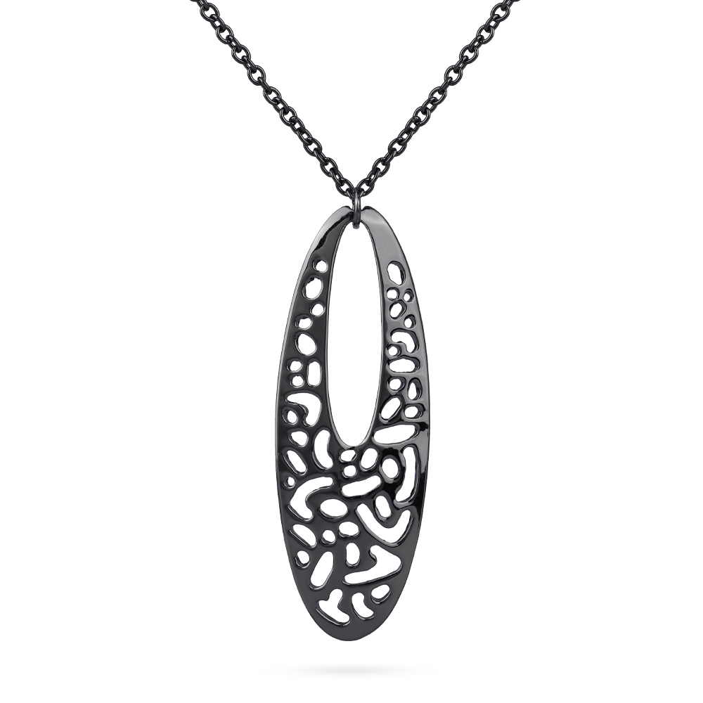 Описание: Изготовлено из ювелирного сплава на основе латуни с гальваническим покрытием черным родием. Длина цепочки 85см. Замок-карабин с удлинителем 5см. Длина кулона 5.3см.