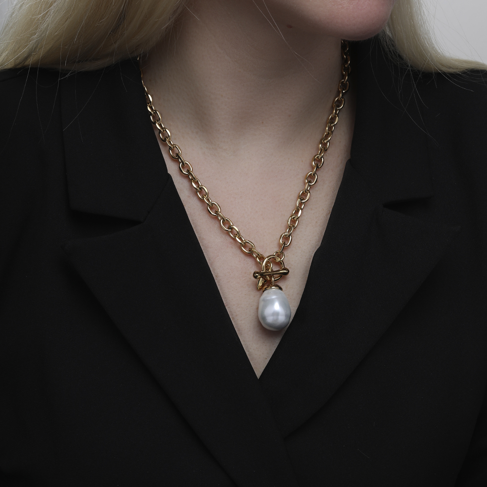 Описание: Изготовлено из ювелирного сплава на основе латуни с гальваническим покрытием золотом. Изделие украшает барочный жемчуг Майорка белого цвета диаметром 18мм. Длина цепочки якорного плетения 50см.