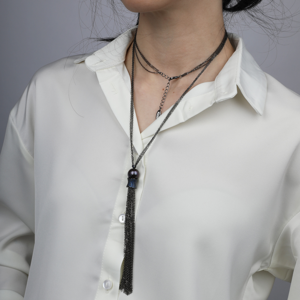 Описание: Изготовлено из ювелирного сплава на основе латуни с гальваническим покрытием черным родием. Изделие выполнено из натурального баклажанового жемчуга диаметром 16мм и синих фианитов. Длина 85-90см.