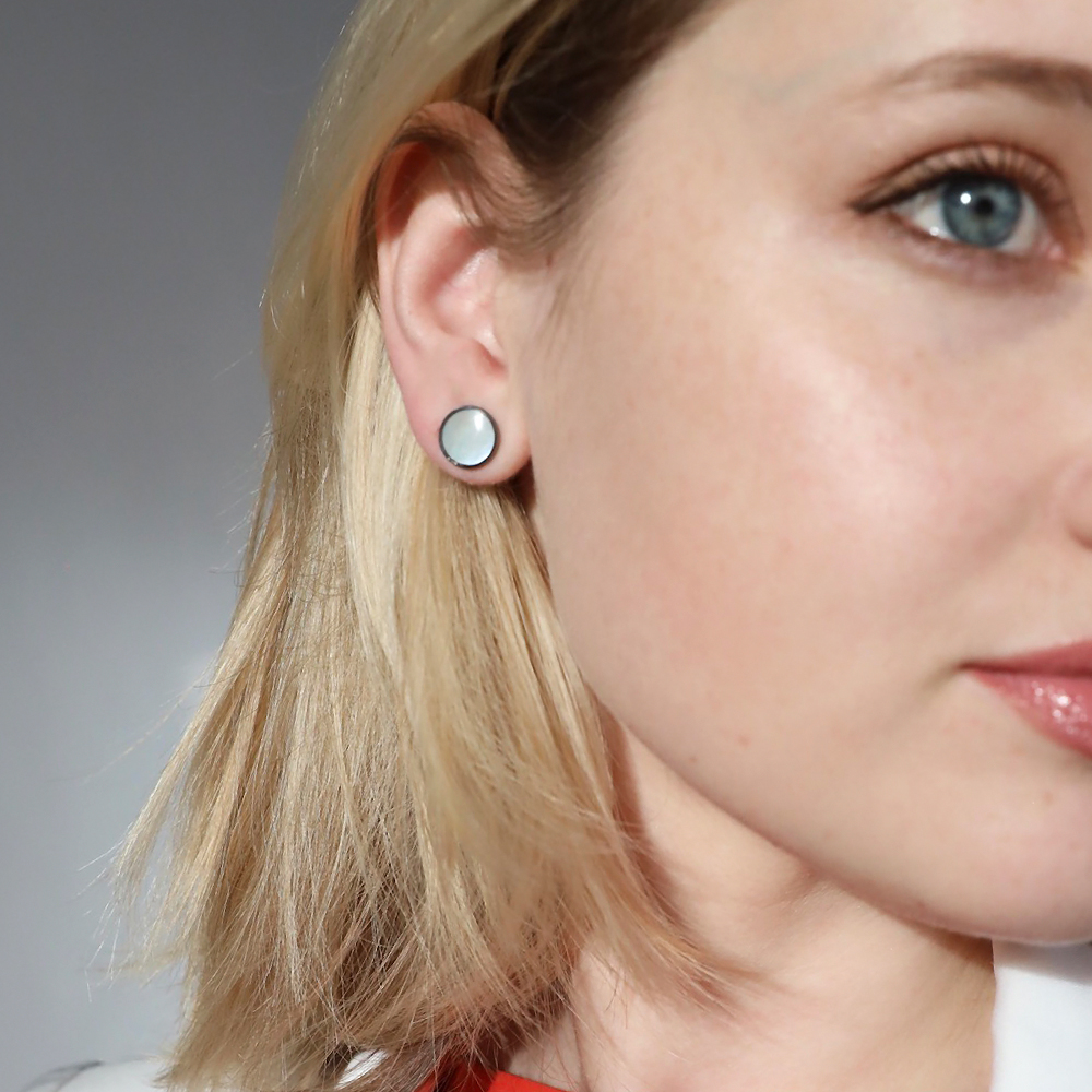 Описание: Изготовлено из ювелирного сплава на основе латуни с гальваническим покрытием черным родием. Изделие украшает перламутр. Диаметр серьги 10мм. Застежка-гвоздики.