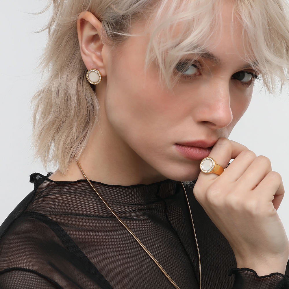 Описание: Изготовлено из ювелирного сплава на основе латуни с гальваническим покрытием золотом. Изделие украшает перламутр. Диаметр серьги 1.5см. Застежка-гвоздики.