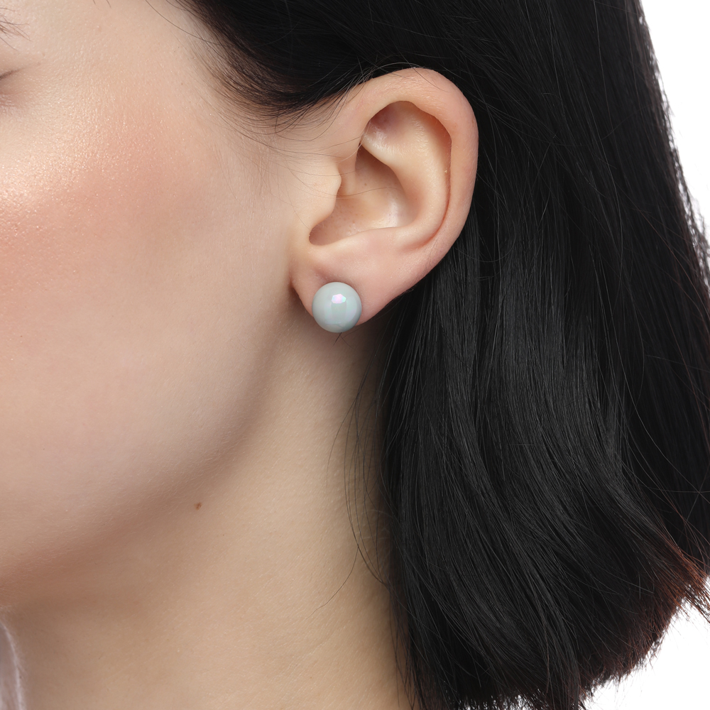 Описание: Изготовлено из ювелирного сплава на основе латуни с гальваническим покрытием золотом. Изделие украшает майорский жемчуг голубого цвета диаметром 12мм. Застёжка-гвоздики.