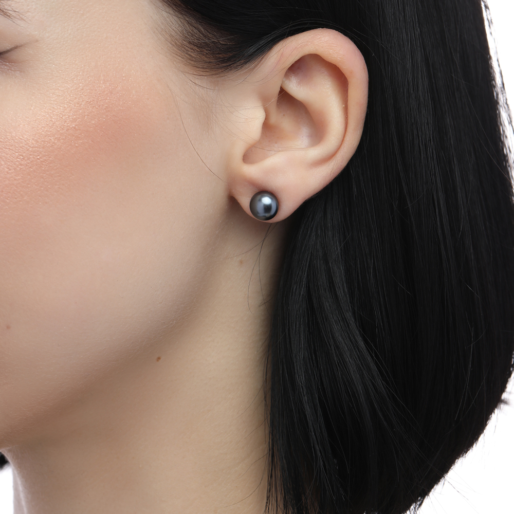 Описание: Изготовлено из ювелирного сплава на основе латуни с гальваническим покрытием родием. Изделие украшает майорский жемчуг темно-серого цвета диаметром 8мм. Застёжка-гвоздики.