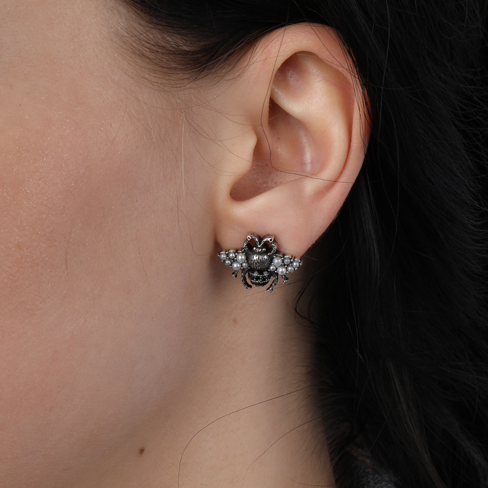 Описание: Изготовлено из ювелирного сплава на основе латуни с гальваническим покрытием античным серебром. Изделие украшают жемчуг Майорка белого цвета, эмаль и кристаллы черного цвета. Застежка — гвоздики. Размер пусетов 2х1, 5см.