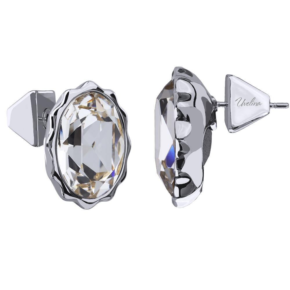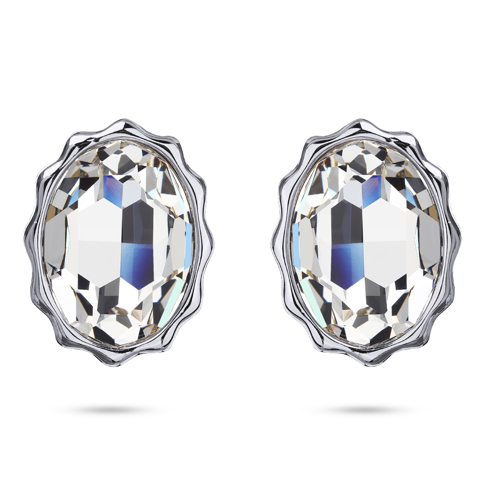 Описание: Изготовлено из ювелирного сплава на основе латуни с гальваническим покрытием родием. Изделие украшают кристаллы SW белого цвета. Размер серьги 14х10мм. Застежка-гвоздики.