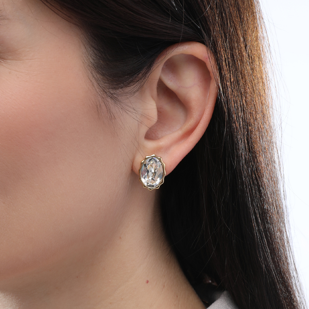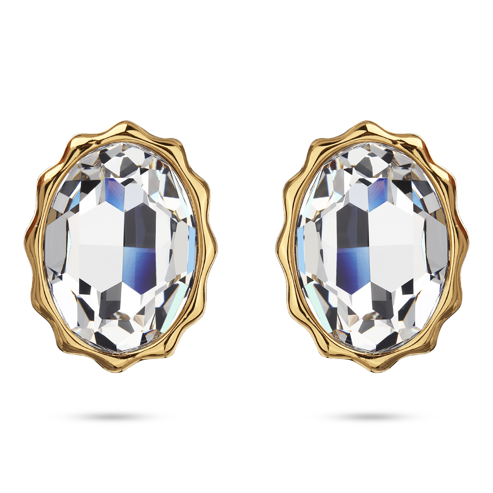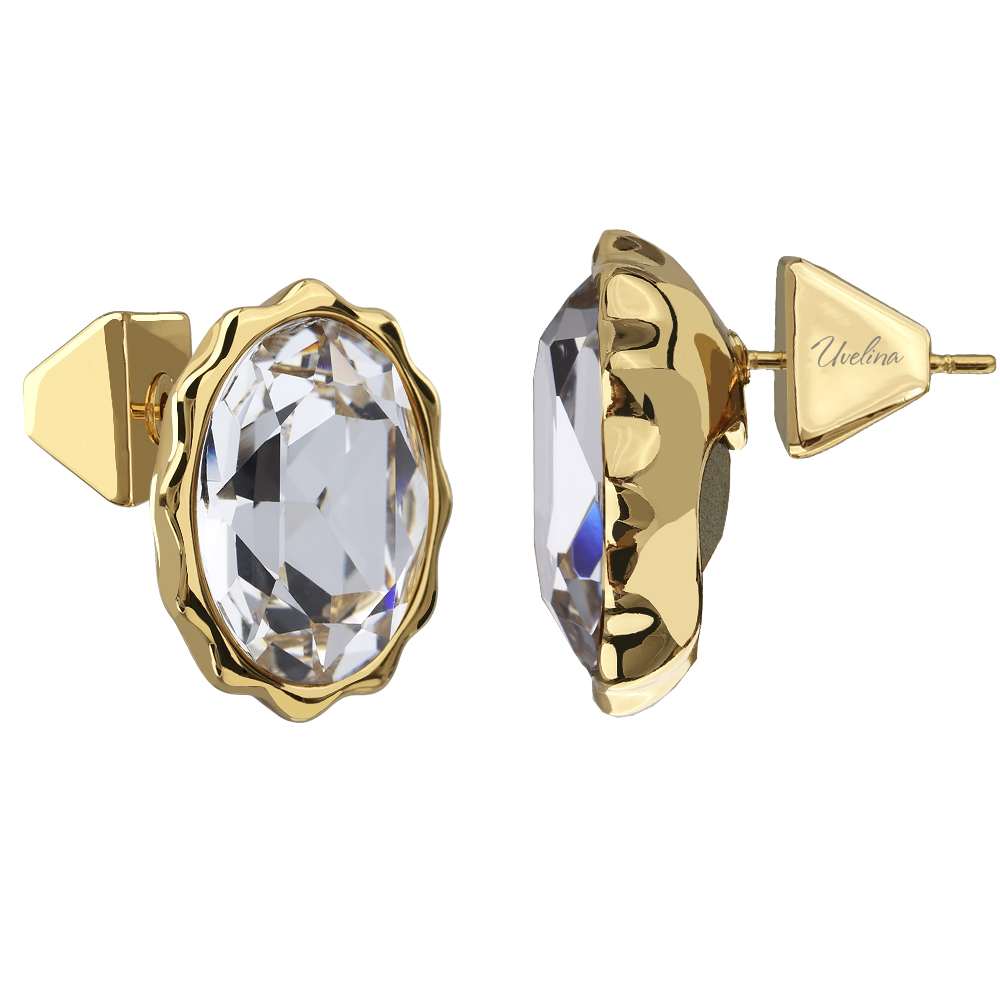 Описание: Изготовлено из ювелирного сплава на основе латуни с гальваническим покрытием золотом. Изделие украшают кристаллы SW белого цвета. Размер серьги 14х10мм. Застежка-гвоздики.