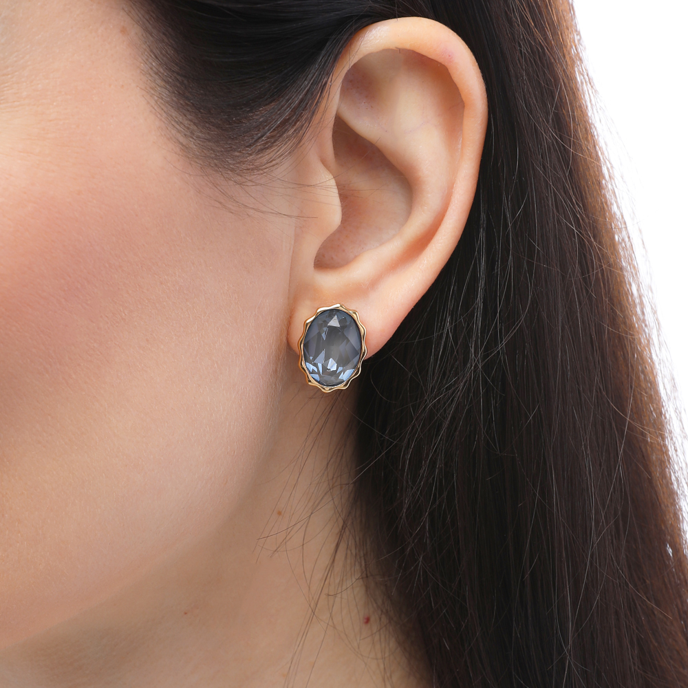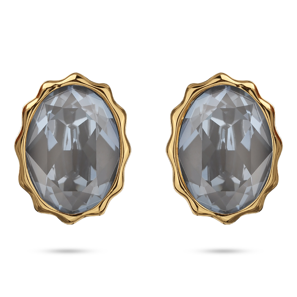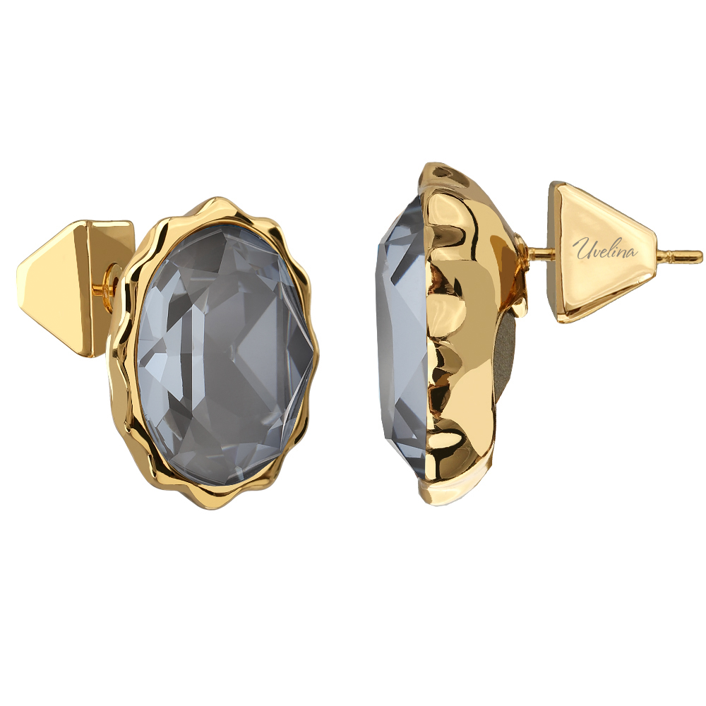 Описание: Изготовлено из ювелирного сплава на основе латуни с гальваническим покрытием золотом. Изделие украшают кристаллы SW дымчато-серого цвета. Размер серьги 14х10мм. Застежка-гвоздики.