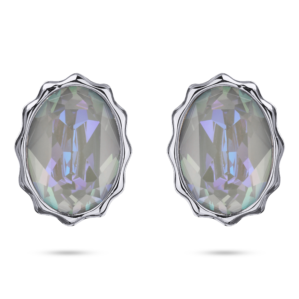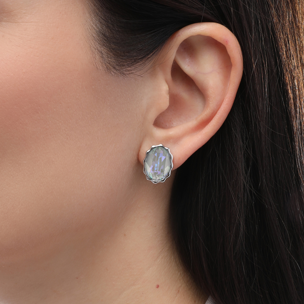 Описание: Изготовлено из ювелирного сплава на основе латуни с гальваническим покрытием родием. Изделие украшают кристаллы SW серо-синего цвета. Размер серьги 14х10мм. Застежка-гвоздики.