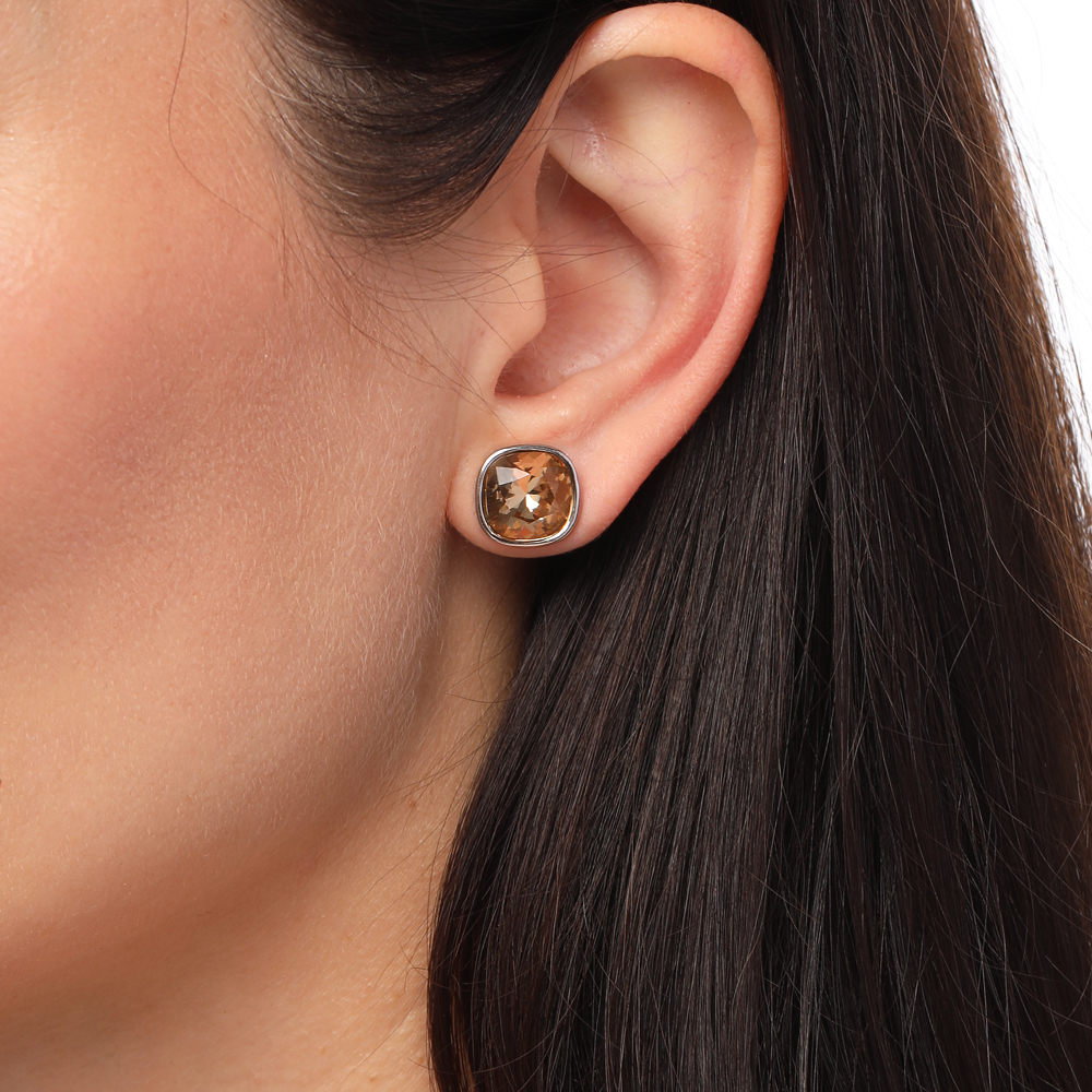 Описание: Изготовлено из ювелирного сплава на основе латуни с гальваническим покрытием родием. Изделие украшают кристаллы SW цвета дымчатый топаз диаметром 10мм. Застежка-гвоздики.