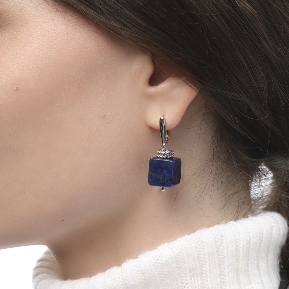 Описание: Изготовлено из ювелирного сплава на основе латуни с гальваническим покрытием родием. Изделие украшают натуральный агат и лазурит размером 13х13мм