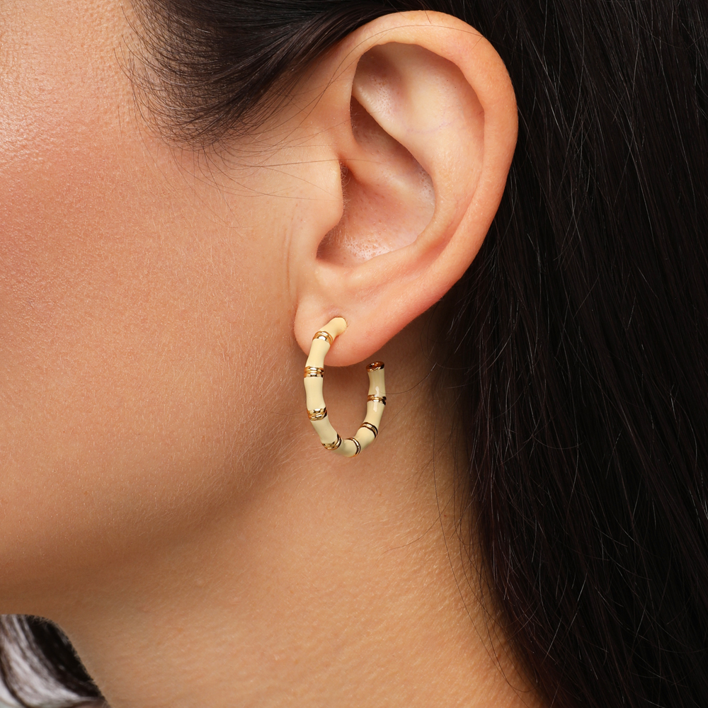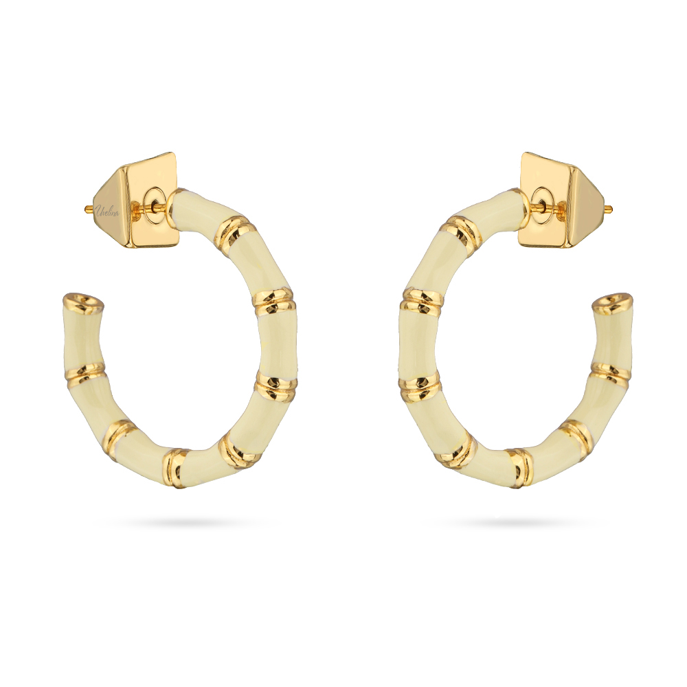 Описание: Изготовлено из ювелирного сплава на основе латуни с гальваническим покрытием золотом. Изделие украшает эмаль цвета сливочного масла. Диаметр серьги 2.5см. Застежка-гвоздики.
