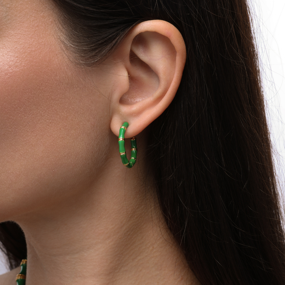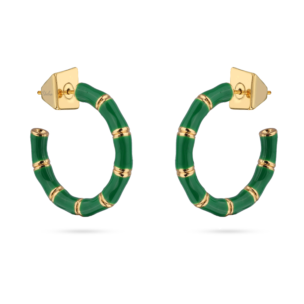 Описание: Изготовлено из ювелирного сплава на основе латуни с гальваническим покрытием золотом. Изделие украшает зеленая эмаль. Диаметр серьги 2.5см. Застежка-гвоздики.