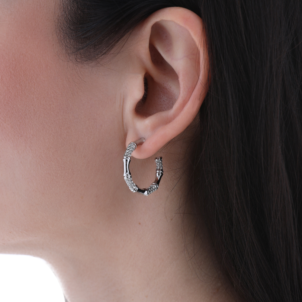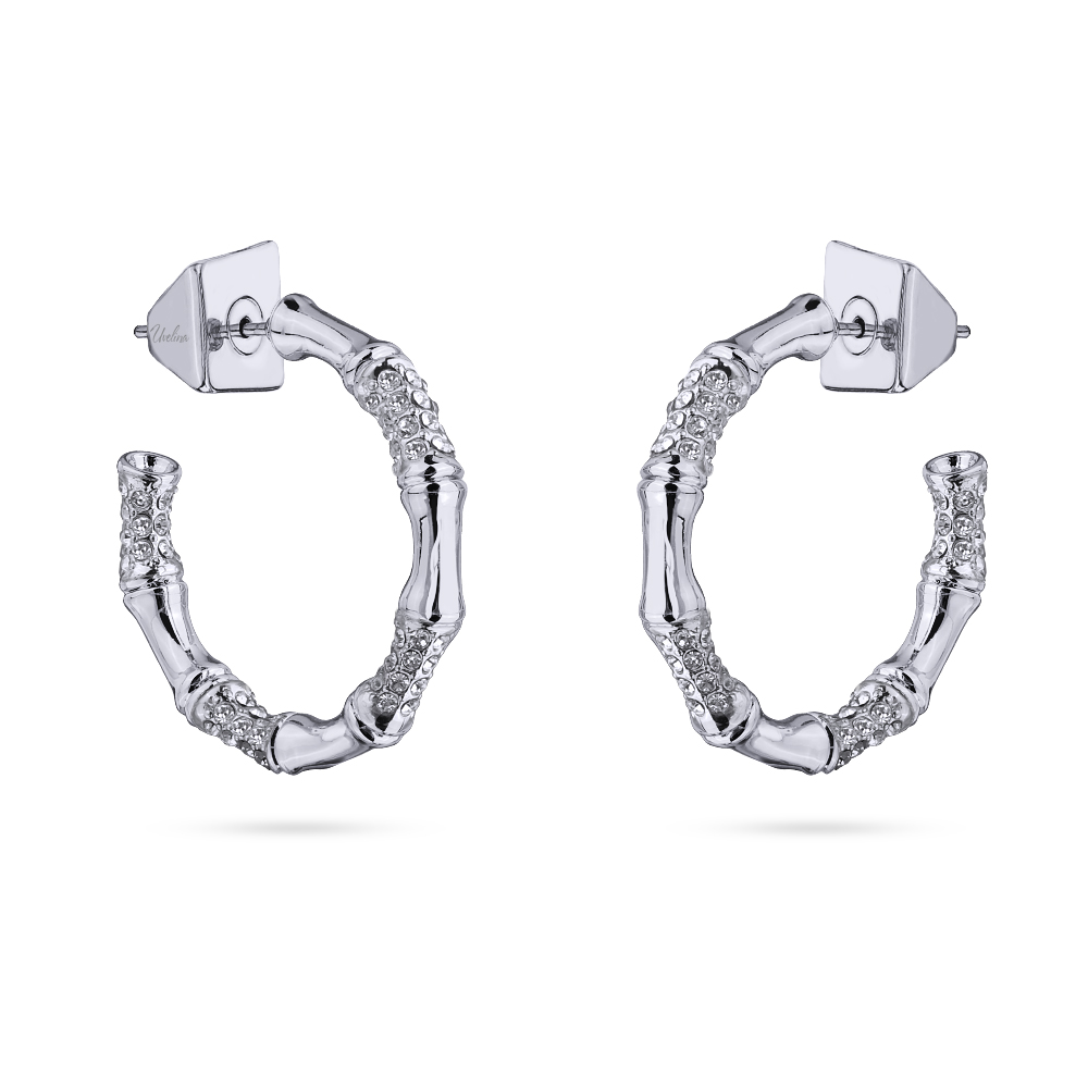 Описание: Изготовлено из ювелирного сплава на основе латуни с гальваническим покрытием родием. Изделие украшают белые кристаллы. Диаметр серьги 2.5см. Застежка-гвоздики.