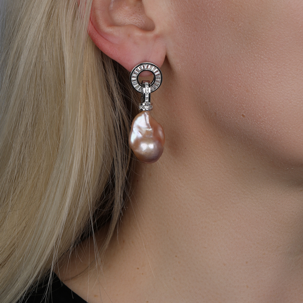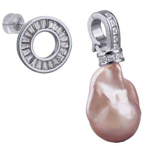 Описание: Изготовлено из ювелирного сплава на основе латуни с гальваническим покрытием родием. Изделие украшают лососевый жемчуг и белый фианит Размер 4, 5х1, 5см. Застежка-гвоздики. *Цвет и форма жемчужин может отличаться от изображенной на фото.