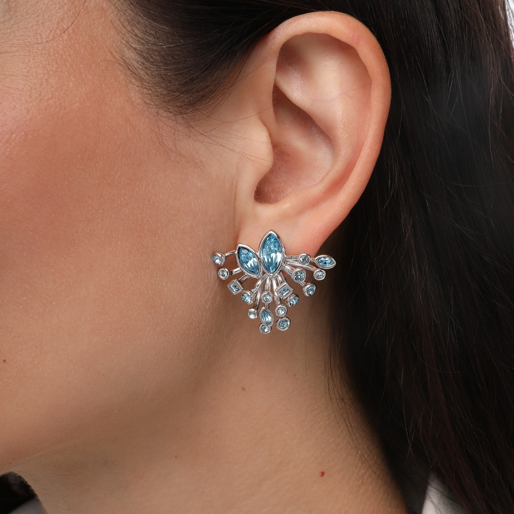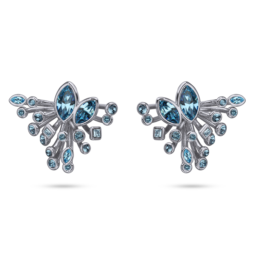 Описание: Изготовлено из ювелирного сплава на основе латуни с гальваническим покрытием родием. Изделие украшают кристаллы SW цвета аквамарин. Размер серьги 3х2.5см. Застежка-гвоздики.