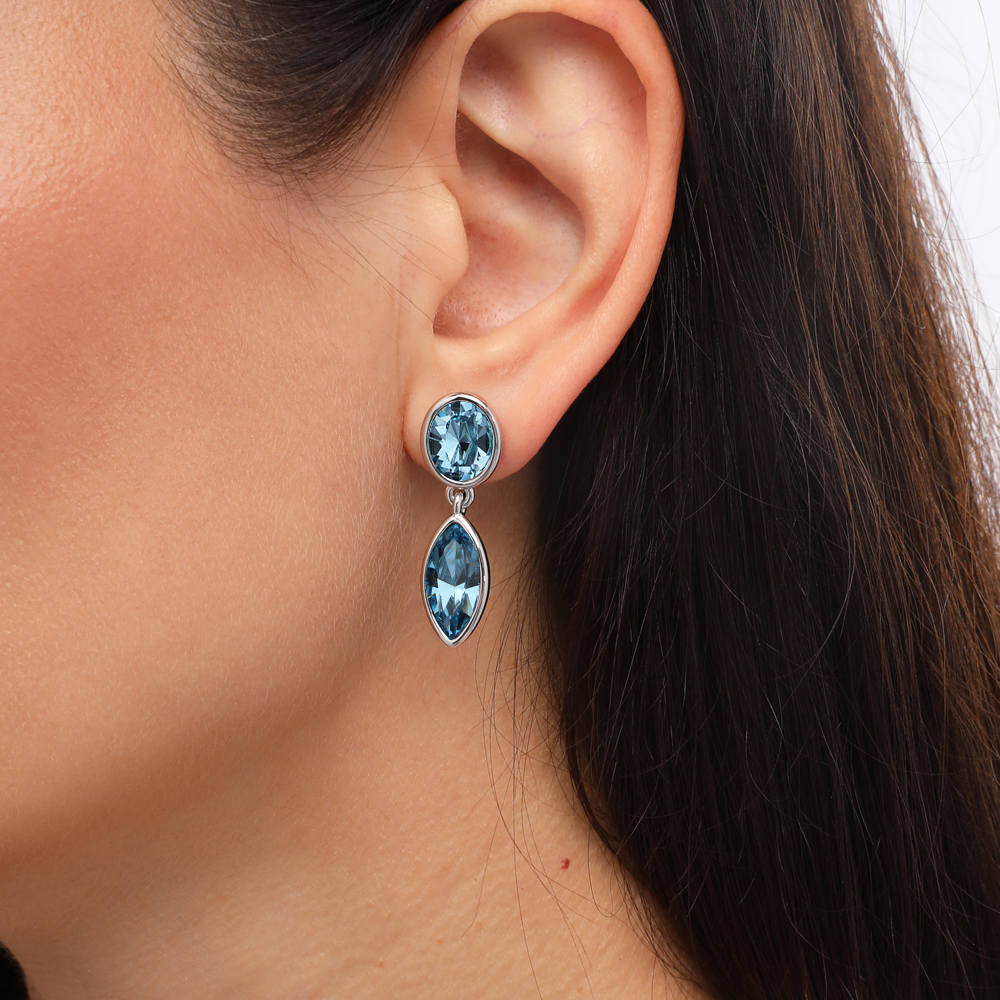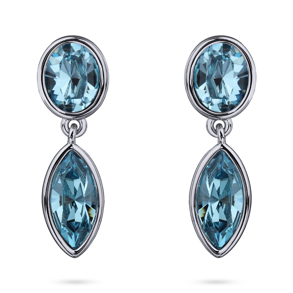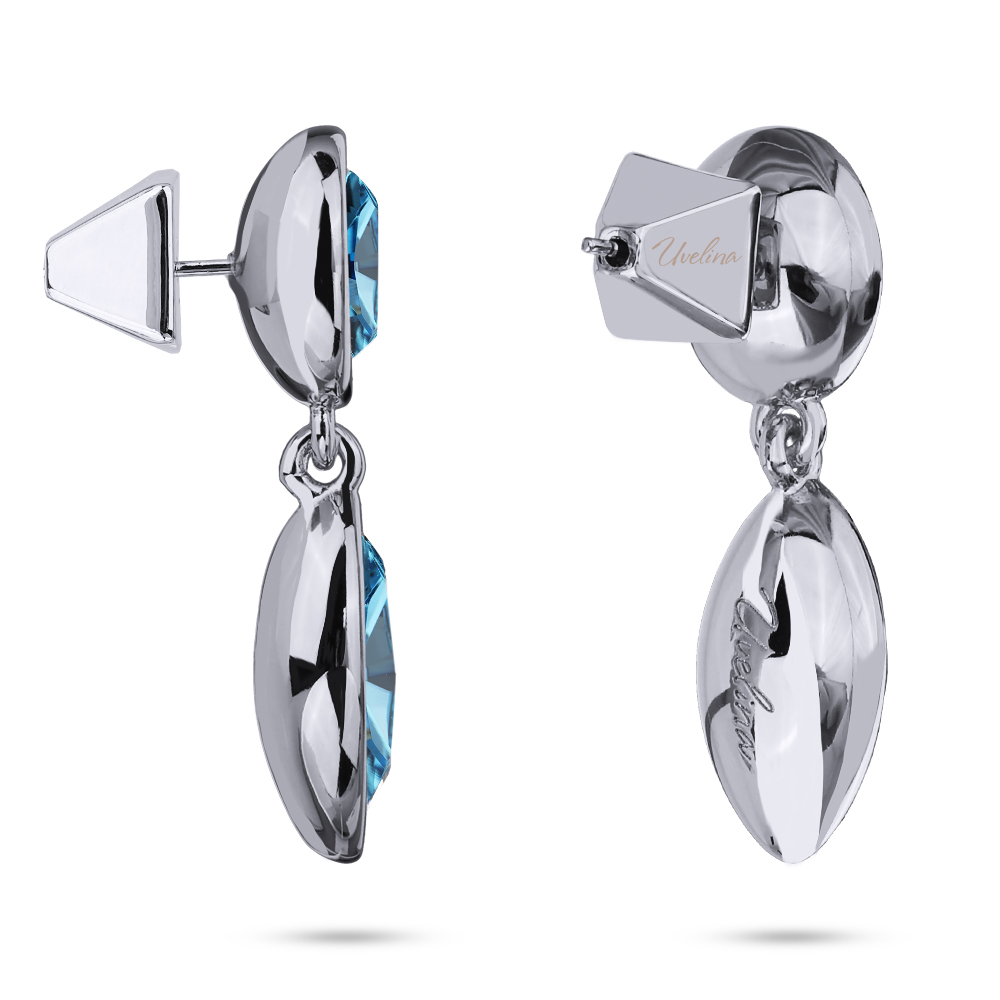 Описание: Изготовлено из ювелирного сплава на основе латуни с гальваническим покрытием родием. Изделие украшают кристаллы SW цвета аквамарин. Размер серьги 3.5х1см. Застежка-гвоздики.