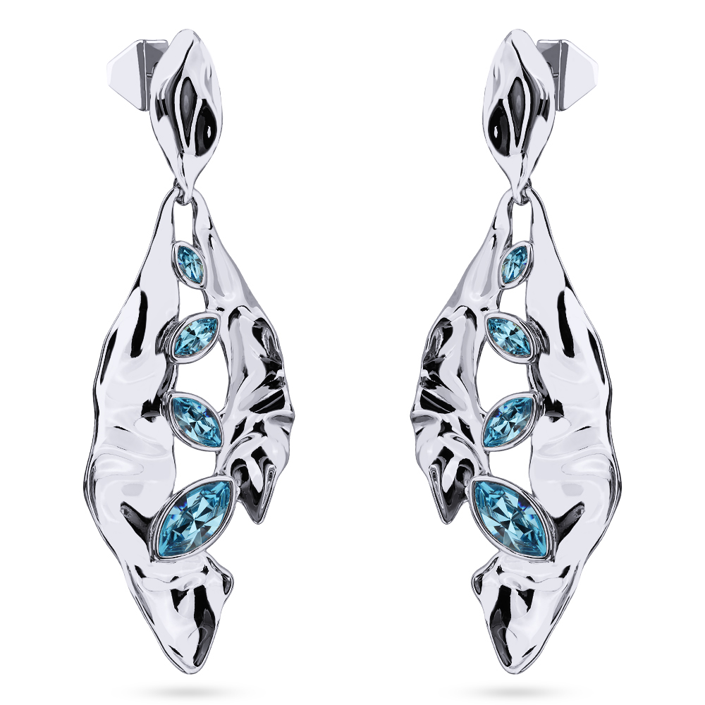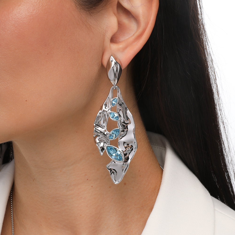 Описание: Изготовлено из ювелирного сплава на основе латуни с гальваническим покрытием родием. Изделие украшают кристаллы SW цвета аквамарин. Размер серьги 9.5х3.5см. Застежка-гвоздики.