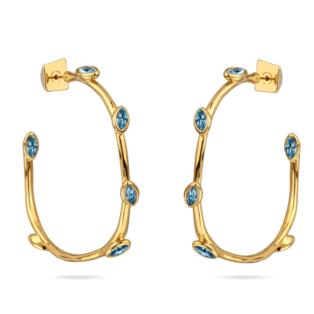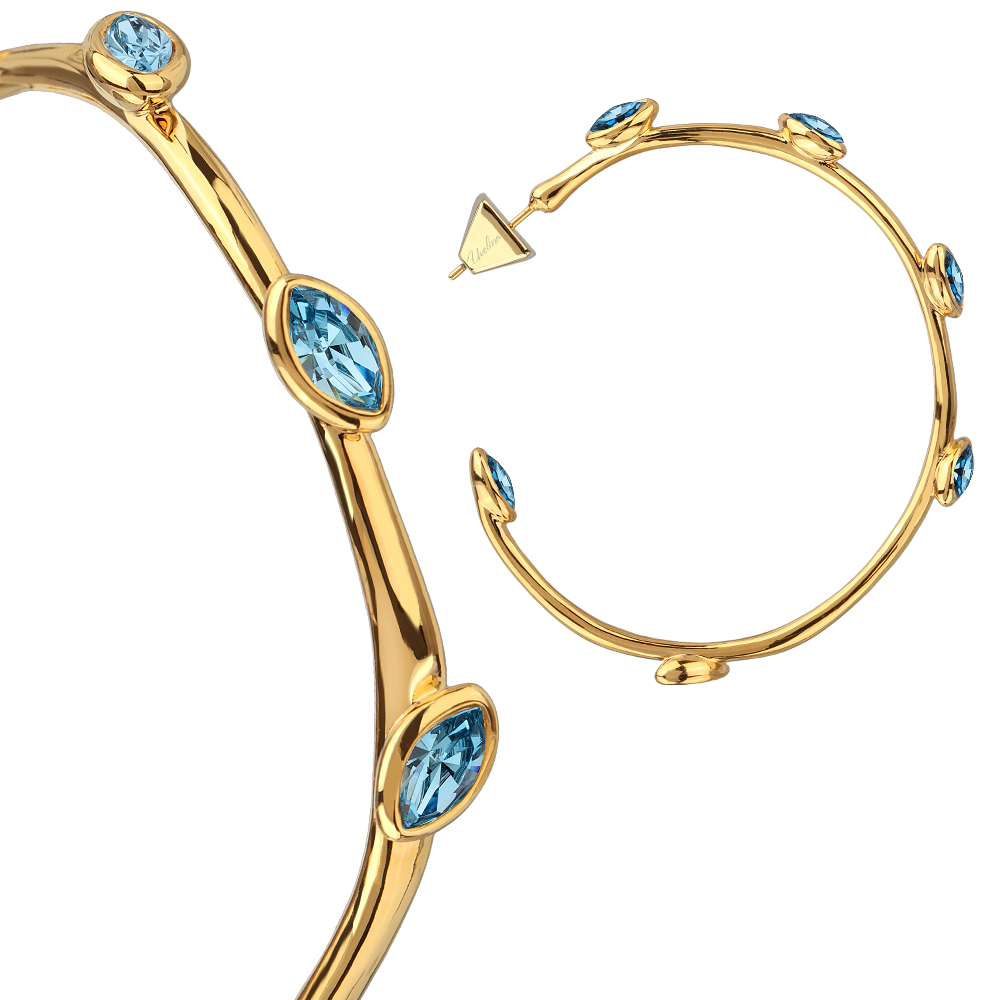 Описание: Изготовлено из ювелирного сплава на основе латуни с гальваническим покрытием золотом. Изделие украшают кристаллы SW цвета аквамарин. Диаметр серьги 5см. Застежка-гвоздики.