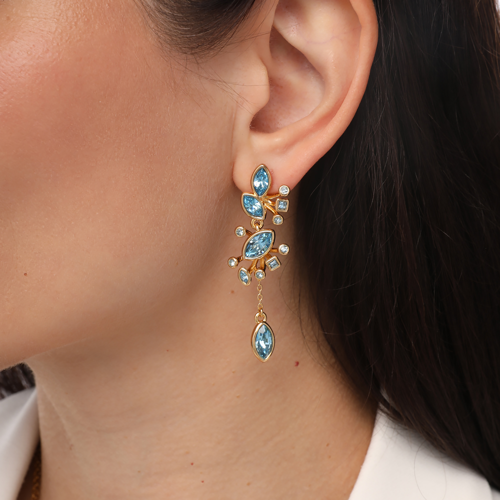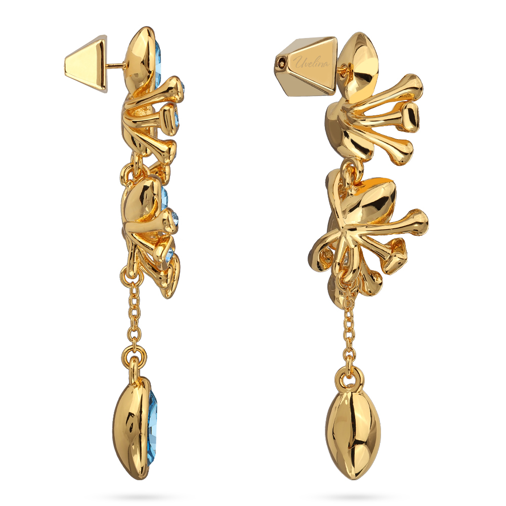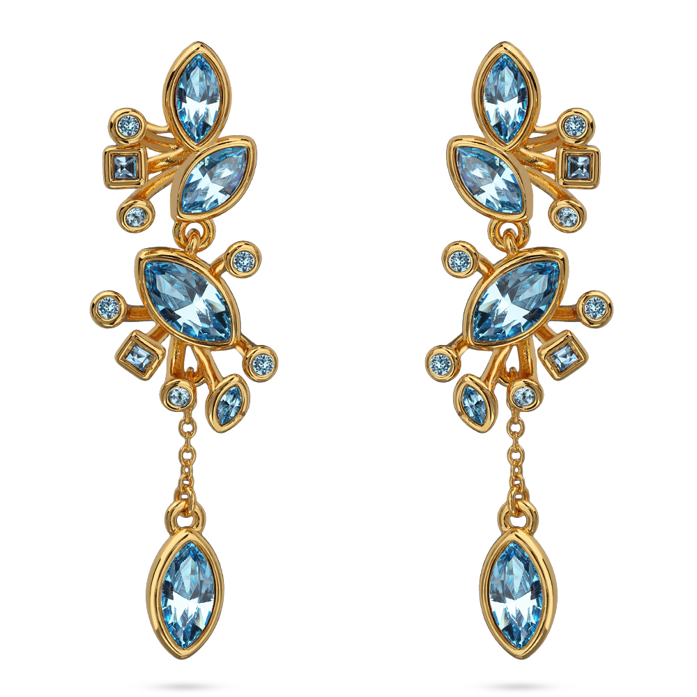 Описание: Изготовлено из ювелирного сплава на основе латуни с гальваническим покрытием золотом. Изделие украшают кристаллы SW цвета аквамарин. Размер серьги 5.5х1.5см. Застежка-гвоздики.