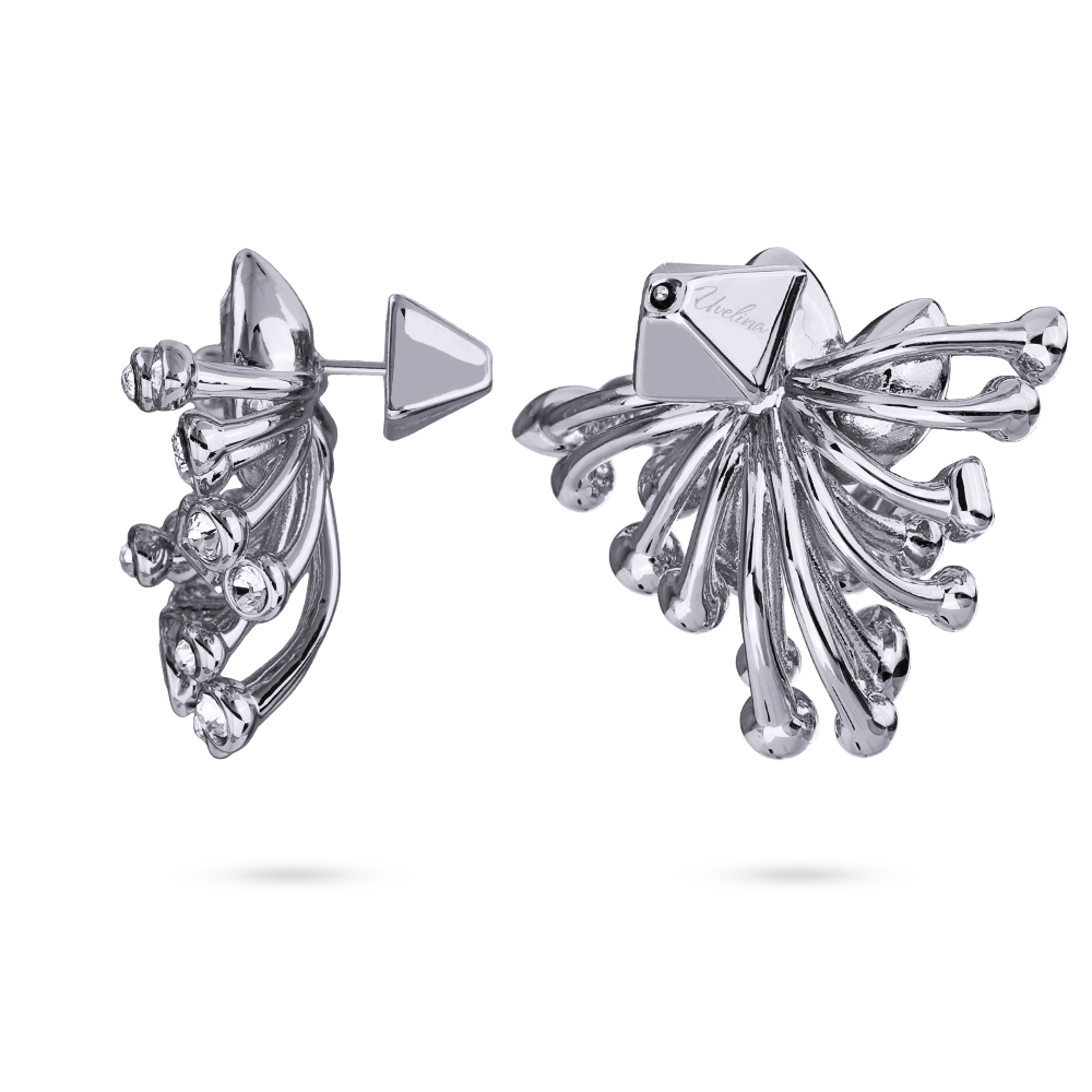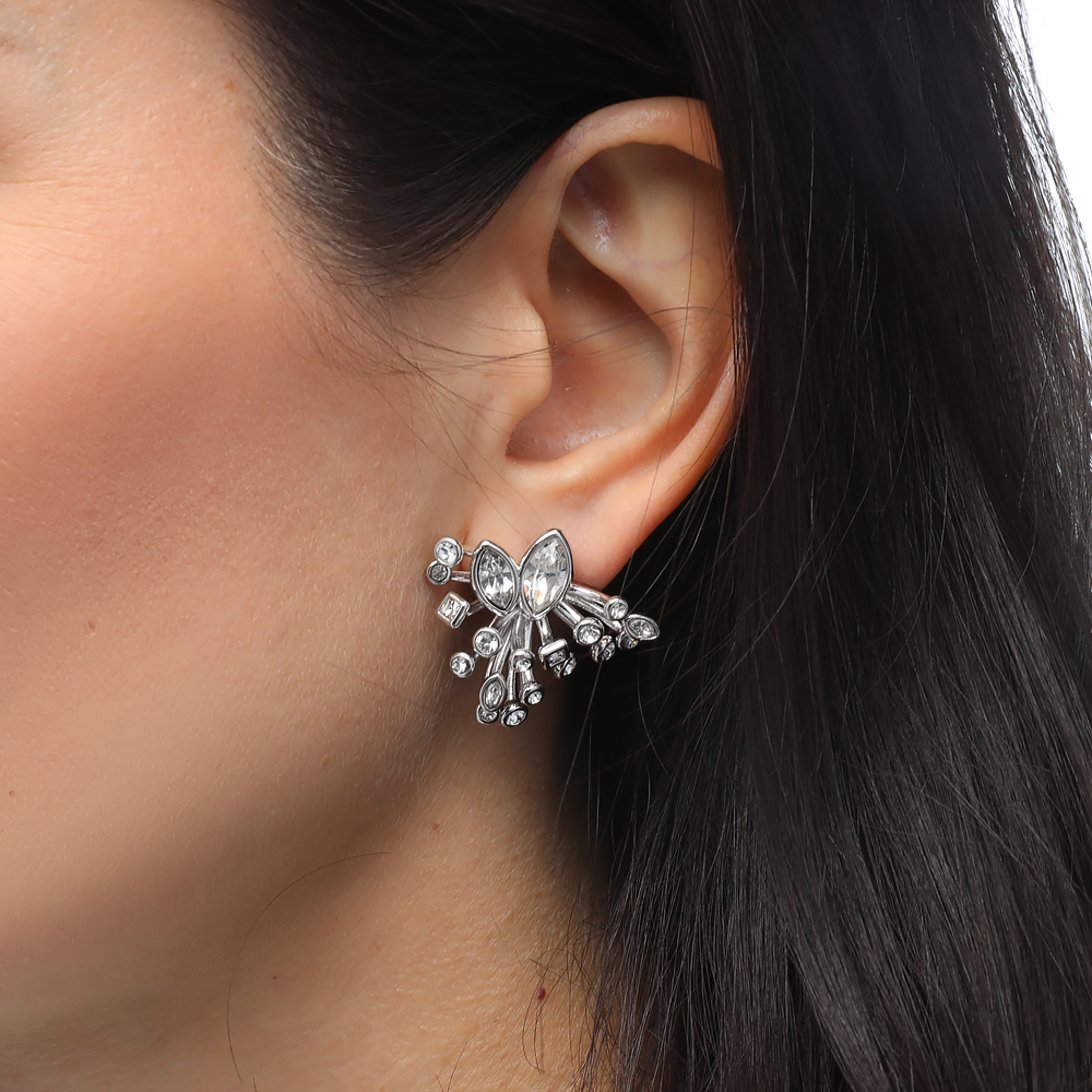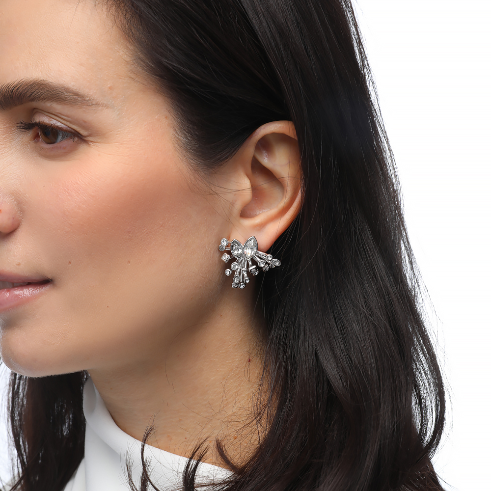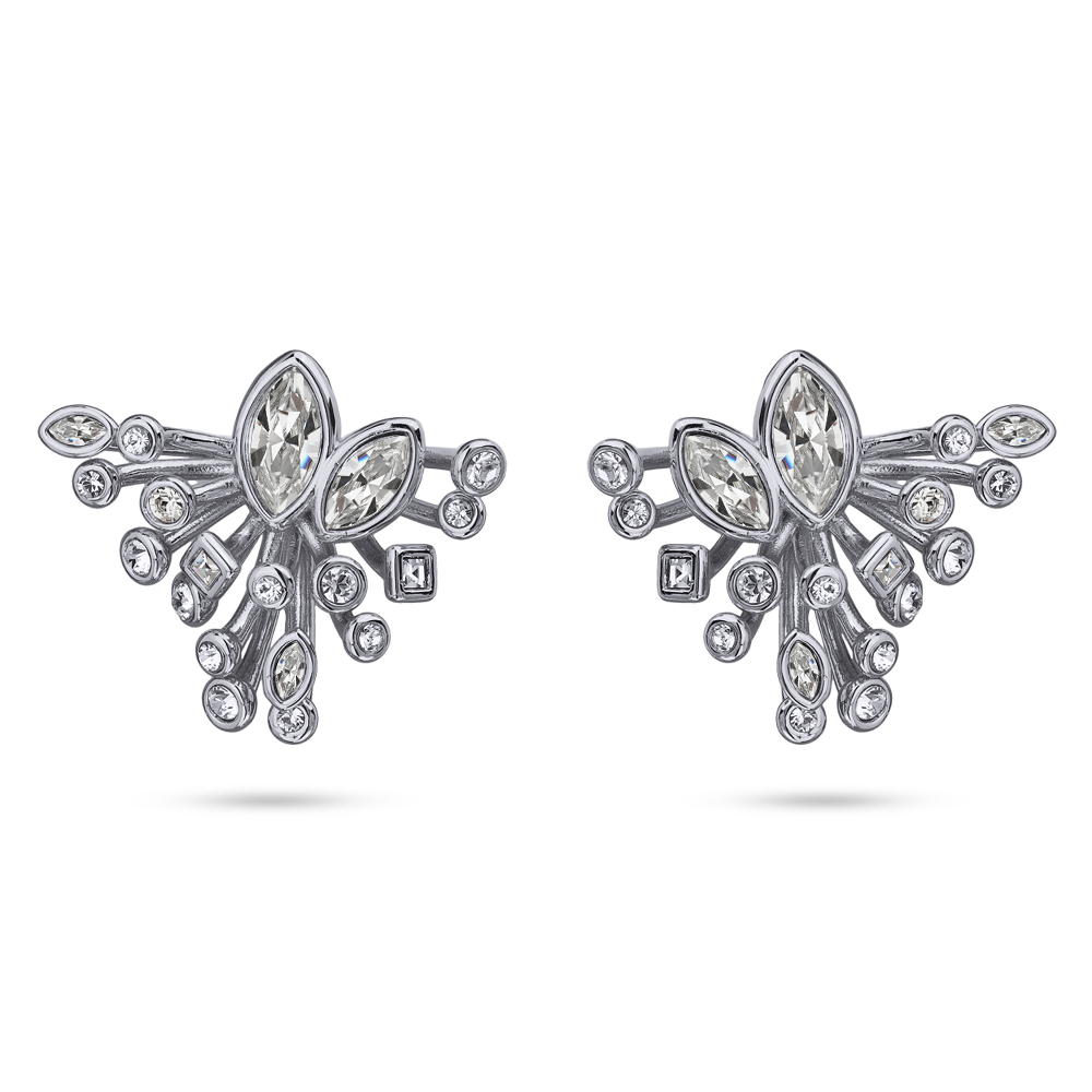 Описание: Изготовлено из ювелирного сплава на основе латуни с гальваническим покрытием родием. Изделие украшают кристаллы SW белого цвета. Размер серьги 3х2.5см. Застежка-гвоздики.
