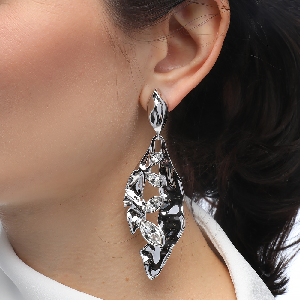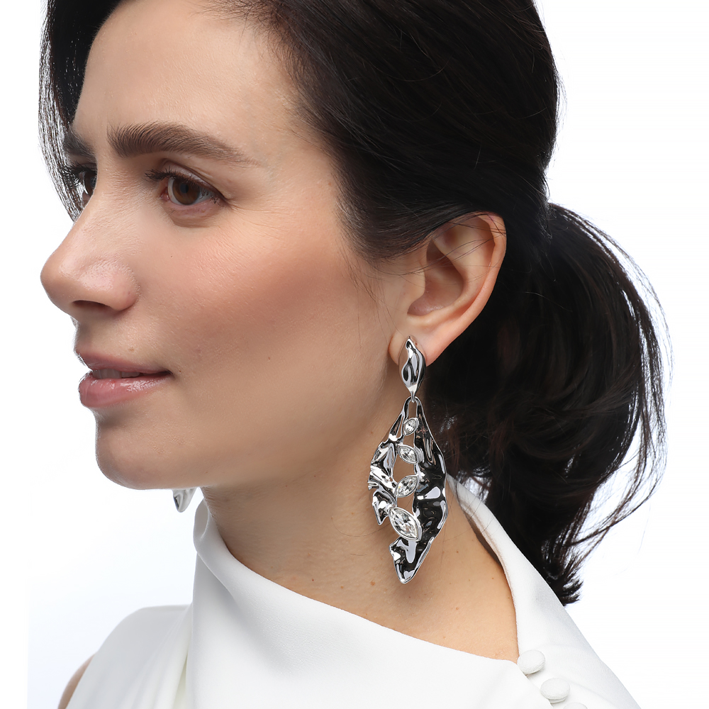 Описание: Изготовлено из ювелирного сплава на основе латуни с гальваническим покрытием родием. Изделие украшают кристаллы SW белого цвета. Размер серьги 9.5х3.5см. Застежка-гвоздики.
