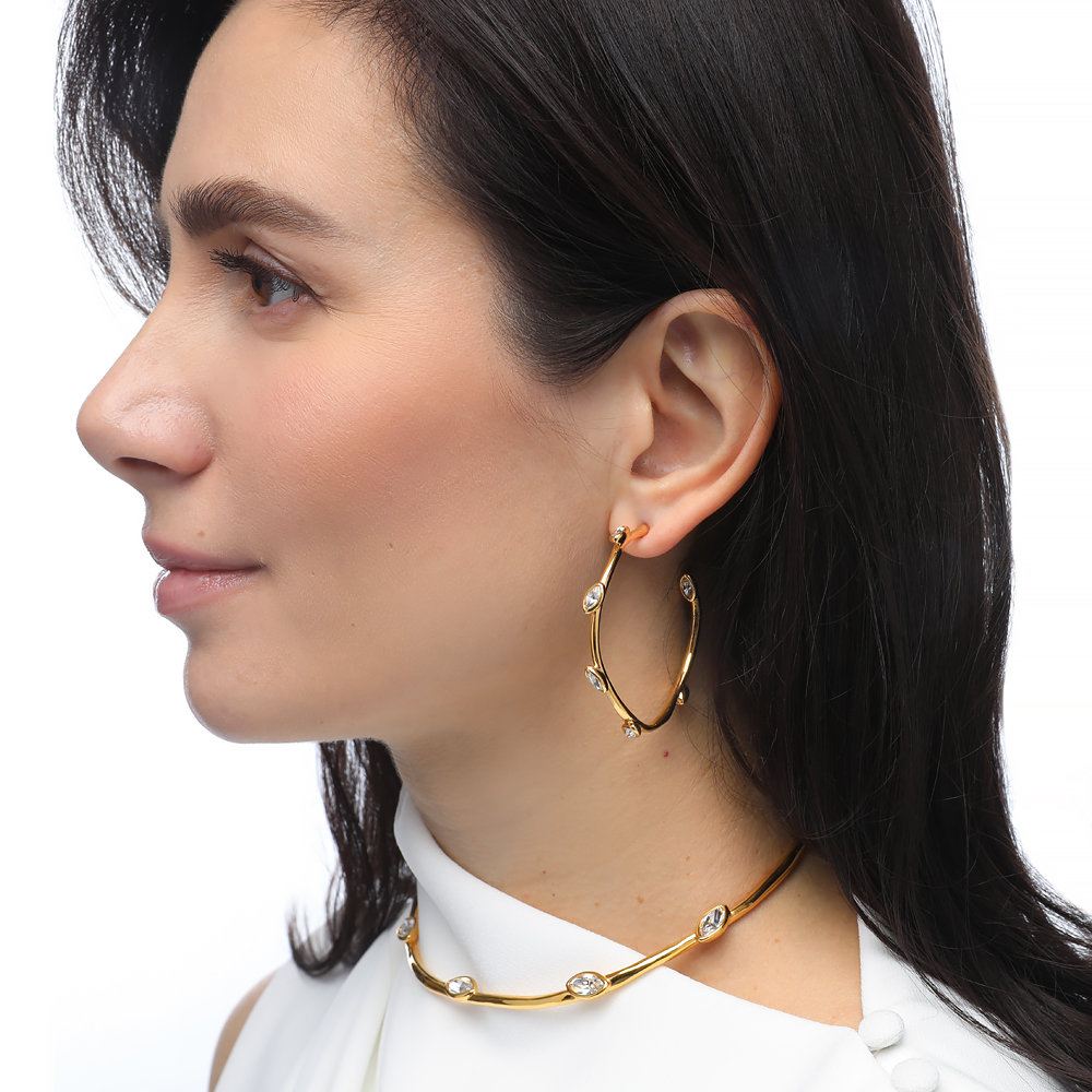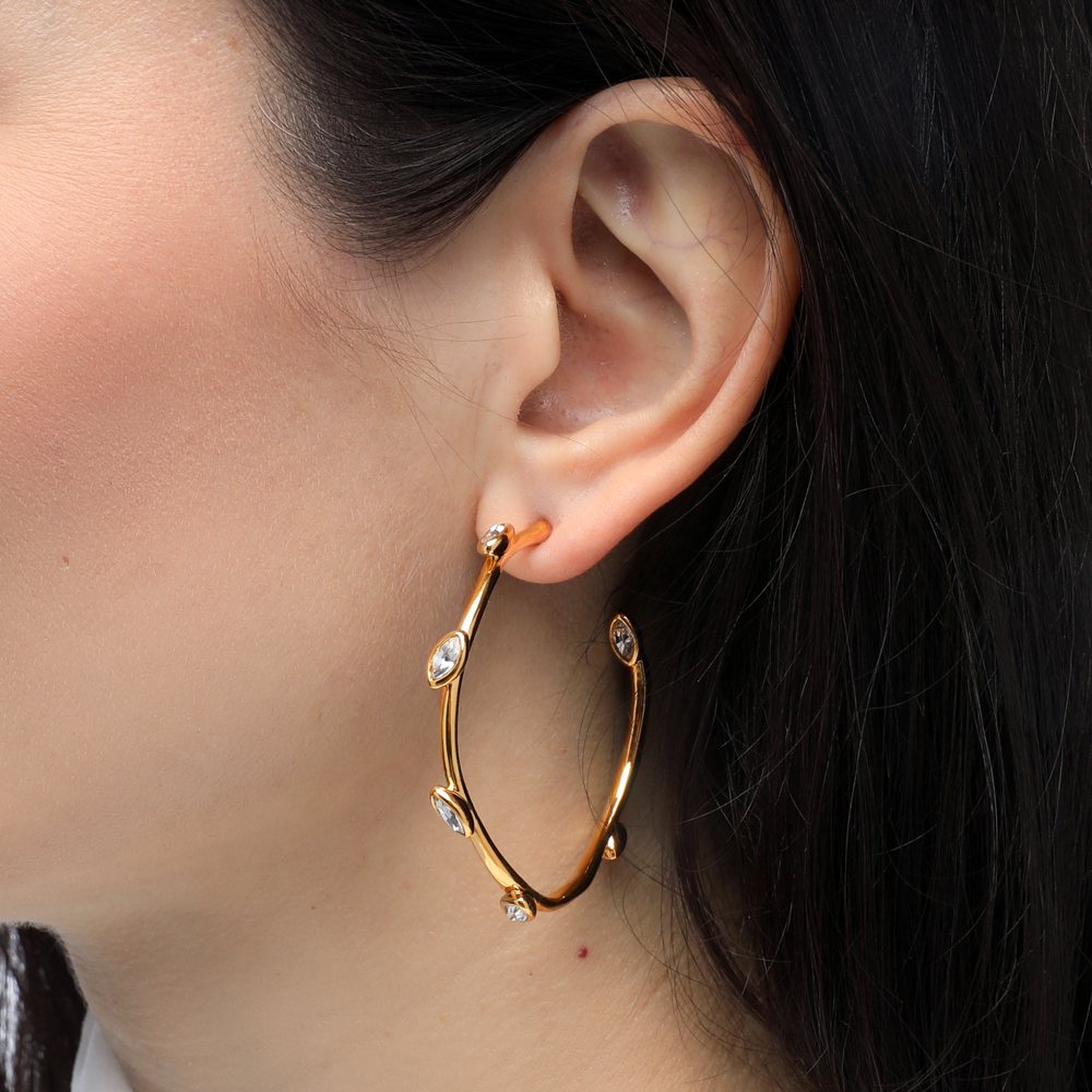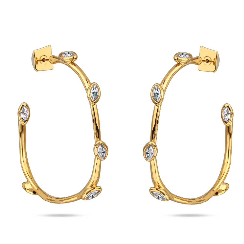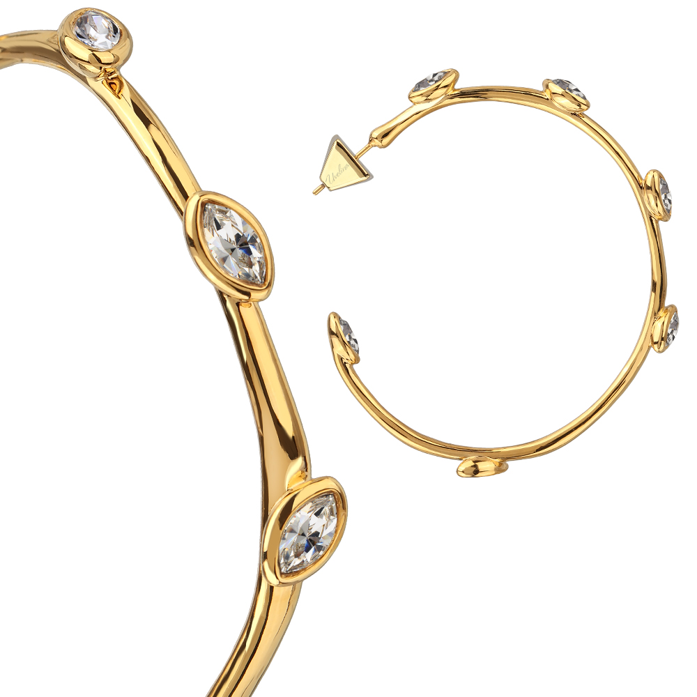 Описание: Изготовлено из ювелирного сплава на основе латуни с гальваническим покрытием золотом. Изделие украшают кристаллы SW белого цвета. Диаметр серьги 5см. Застежка-гвоздики.