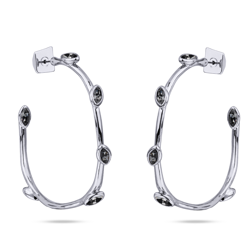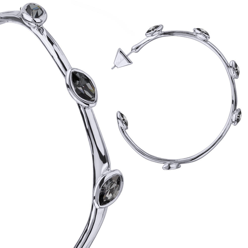 Описание: Изготовлено из ювелирного сплава на основе латуни с гальваническим покрытием родием. Изделие украшают кристаллы SW темно-серого цвета. Диаметр серьги 5см. Застежка-гвоздики.