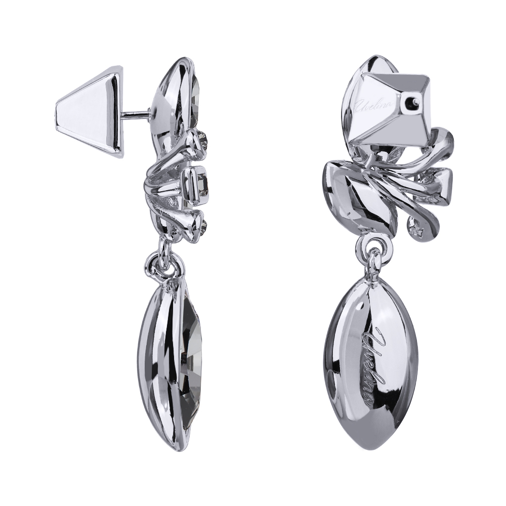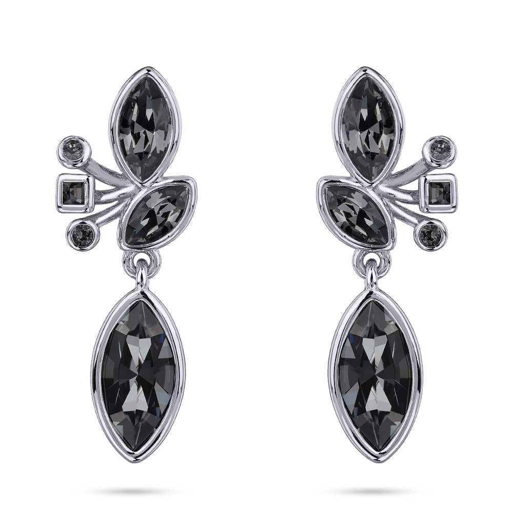 Описание: Изготовлено из ювелирного сплава на основе латуни с гальваническим покрытием родием. Изделие украшают кристаллы SW темно-серого цвета. Размер серьги 4х1.5см. Застежка-гвоздики.