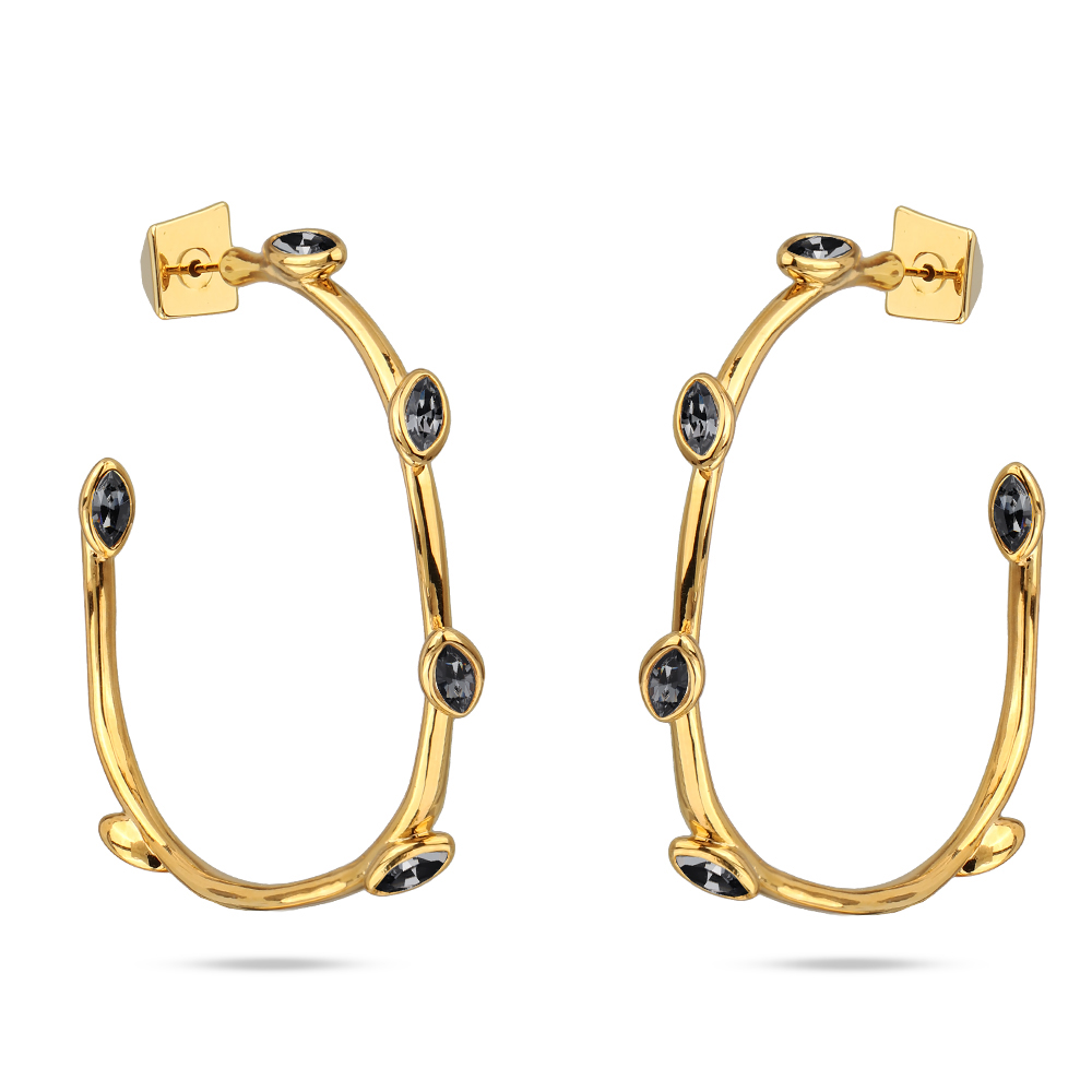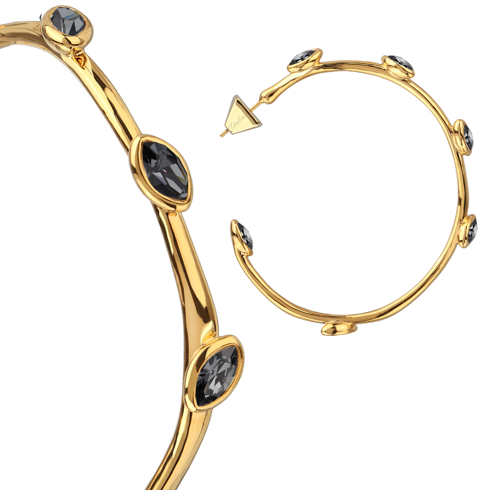 Описание: Изготовлено из ювелирного сплава на основе латуни с гальваническим покрытием золотом. Изделие украшают кристаллы SW темно-серого цвета. Диаметр серьги 5см. Застежка-гвоздики.