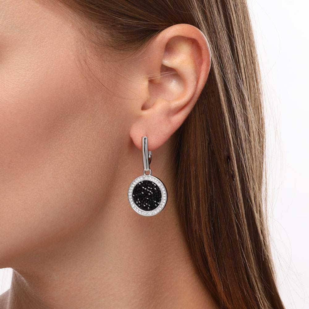 Описание: Изготовлено из ювелирного сплава на основе латуни с гальваническим покрытием родием. Изделие украшают кристаллы SW черного цвета. Размер серьги 4х2см. Английская застежка.
