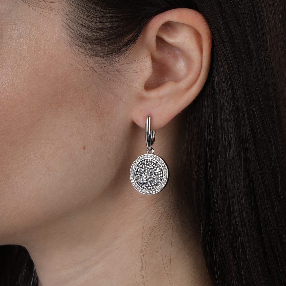 Описание: Изготовлено из ювелирного сплава на основе латуни с гальваническим покрытием родием. Изделие украшают кристаллы SW серебристого цвета. Размер серьги 4х2см.
