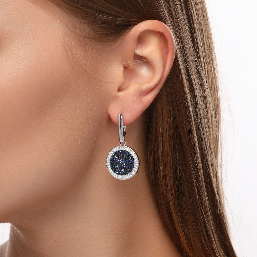 Описание: Изготовлено из ювелирного сплава на основе латуни с гальваническим покрытием родием. Изделие украшают кристаллы SW синего цвета. Размер серьги 4х2см. Английская застежка.