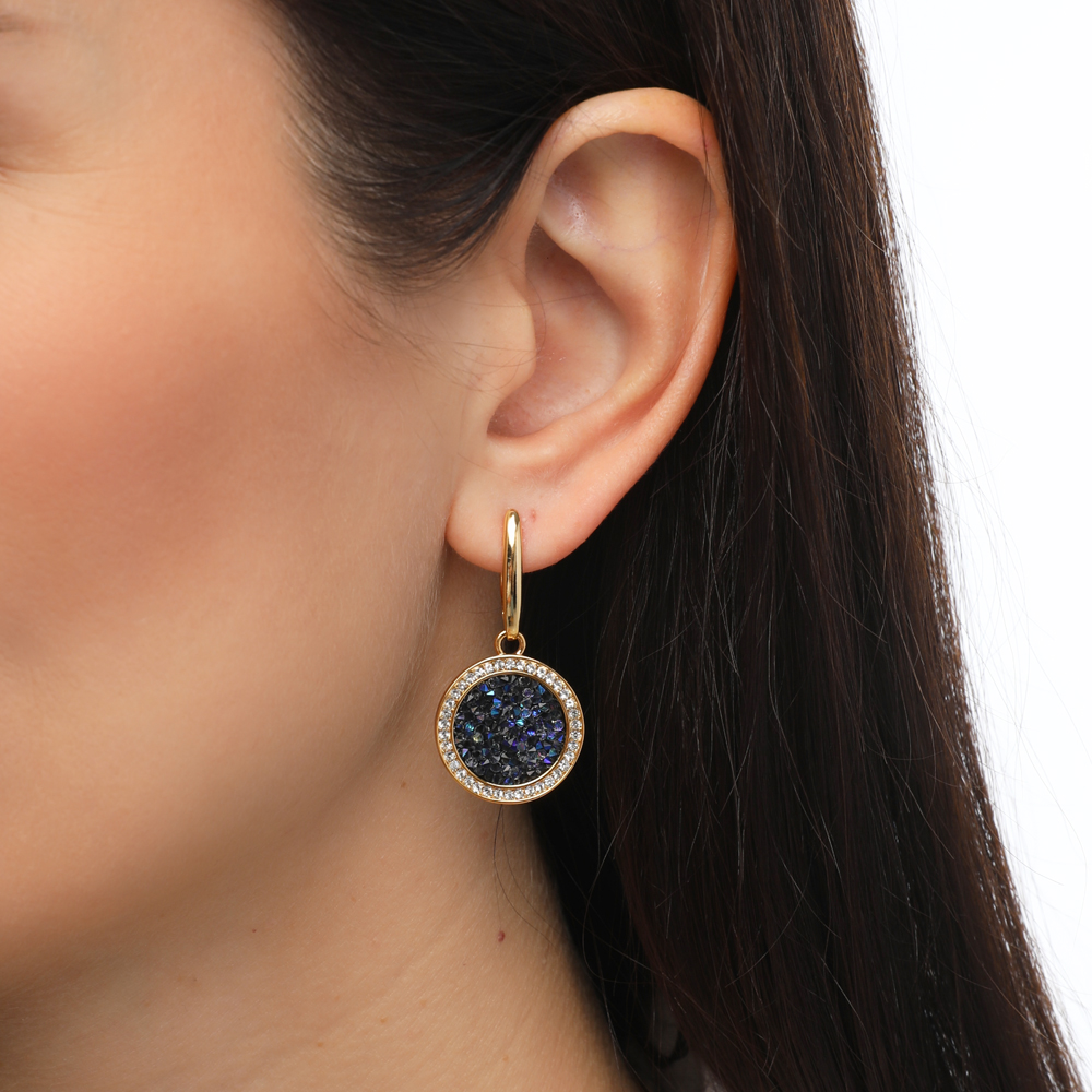 Описание: Изготовлено из ювелирного сплава на основе латуни с гальваническим покрытием золотом. Изделие украшают кристаллы SW синего цвета. Размер серьги 4х2см.