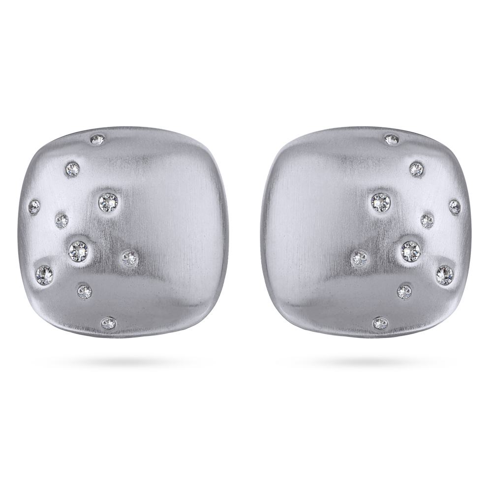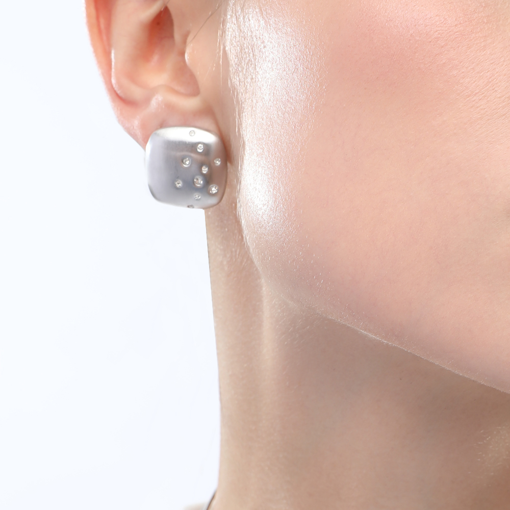 Описание: Изготовлено из ювелирного сплава на основе латуни с гальваническим покрытием сатиновым родием. Изделие украшают кристаллы SW белого цвета. Размер серьги 2х2см.