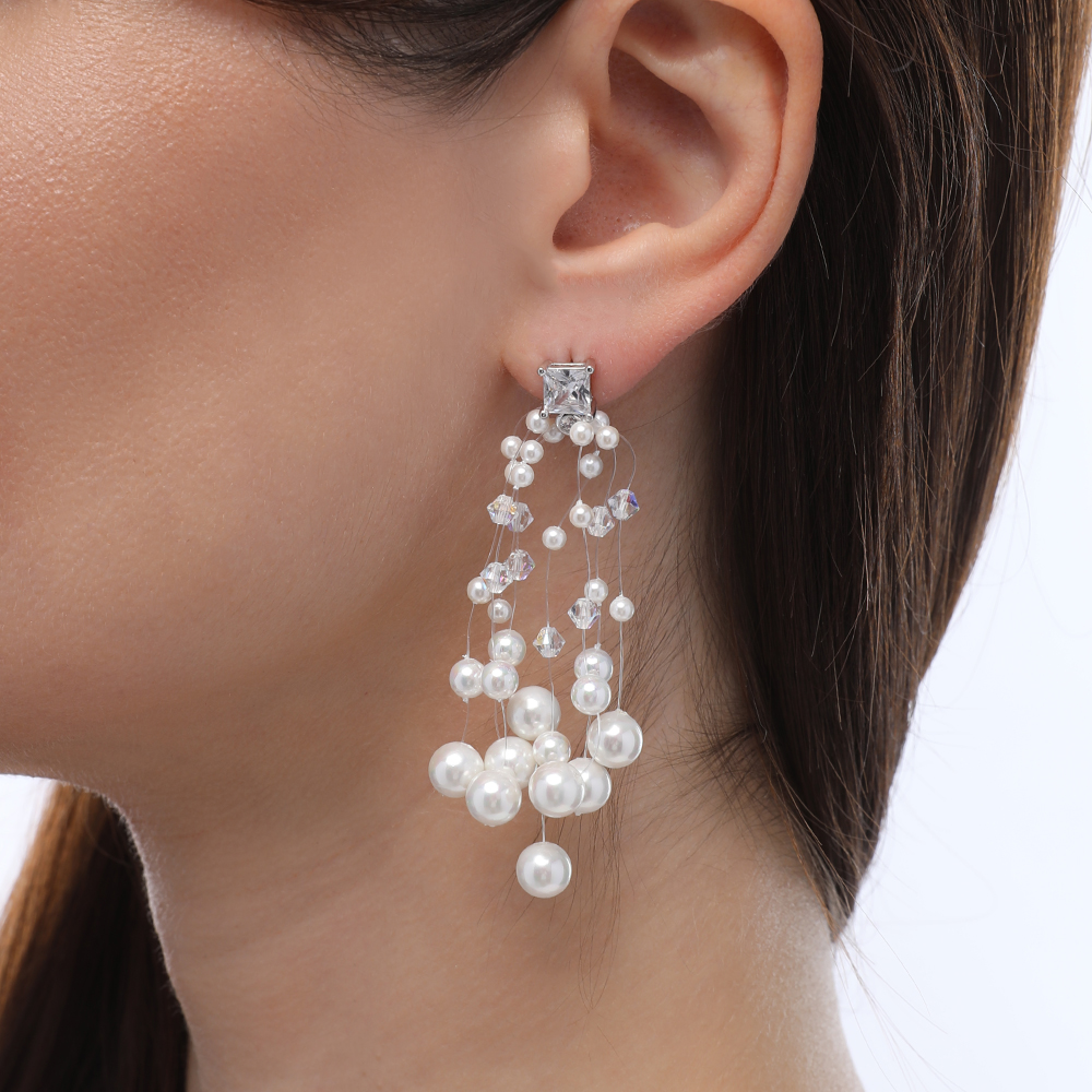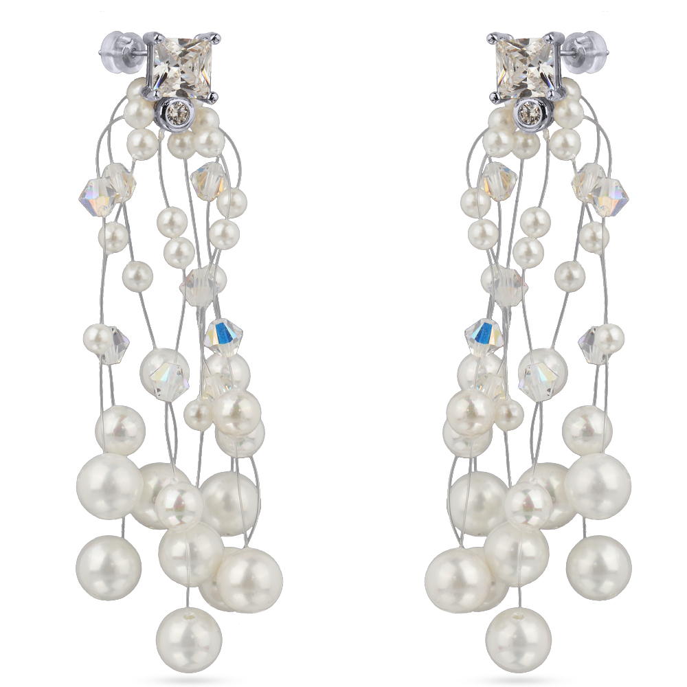 Описание: Изготовлено из ювелирного сплава на основе латуни с гальваническим покрытием родием. Изделие украшают белый жемчуг Майорка диаметром 3-7мм и кристаллы SW белого хамелеон цвета размером 7х7мм. Длина серьги 7, 5см.