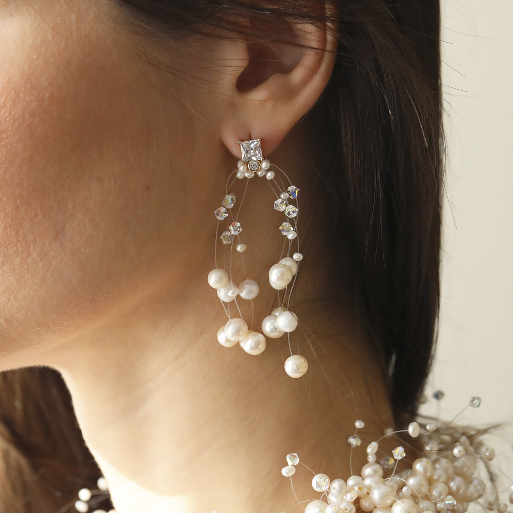 Описание: Изготовлено из ювелирного сплава на основе латуни с гальваническим покрытием золотом. Изделие украшают белый жемчуг диаметром 3-7мм и кристаллы SW белого хамелеон цвета размером 7х7мм. Длина серьги 6, 5см.