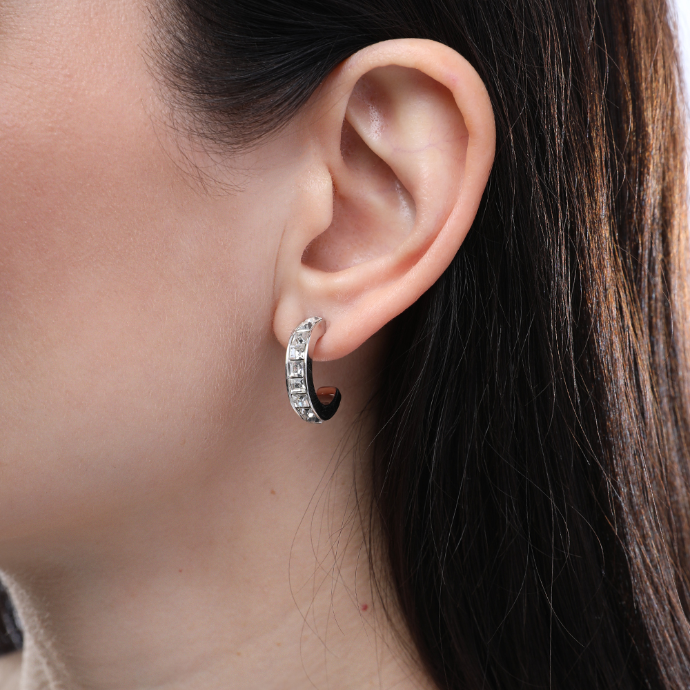 Описание: Изготовлено из ювелирного сплава на основе латуни с гальваническим покрытием родием. Изделие украшают кристаллы SW белого цвета. Размер серьги 2х0.4см. Застежка-гвоздики.