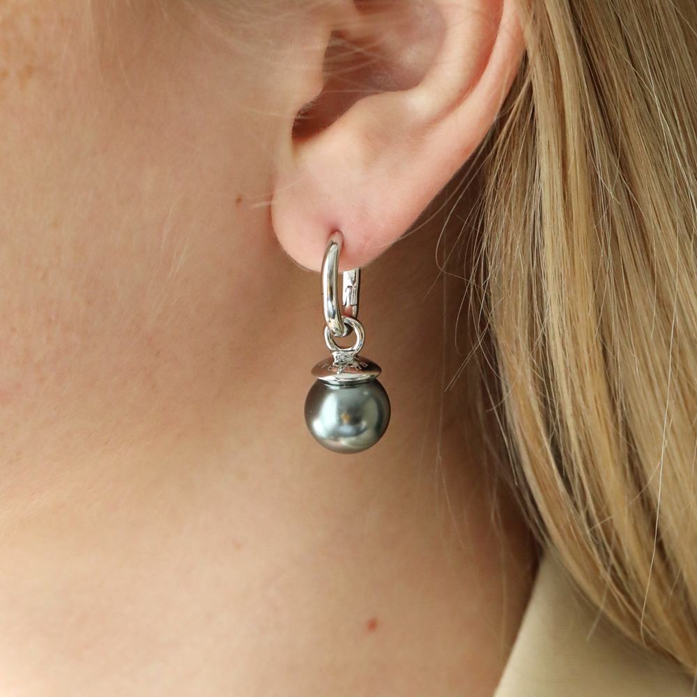 Описание: Изготовлено из ювелирного сплава на основе латуни с гальваническим покрытием родием. Изделие украшает майорский круглый жемчуг темно-серого цвета диаметром 12мм. Английский замок. Длина 3см.
