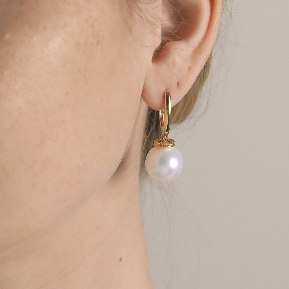 Описание: Изготовлено из ювелирного сплава на основе латуни с гальваническим покрытием золотом. Изделие украшает круглый жемчуг Майорка белого цвета диаметром 14мм. Длина серьги 3.5см. Английская застежка.