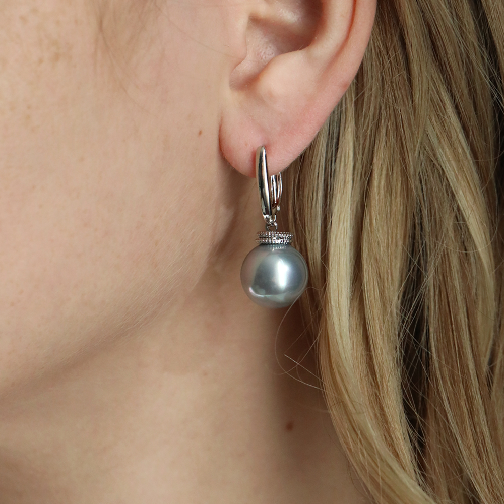 Описание: Изготовлено из ювелирного сплава на основе латуни с гальваническим покрытием родием. Изделие украшает круглый жемчуг Майорка серо-голубого цвета диаметром 14мм. Длина серьги 3.5см. Английская застежка.