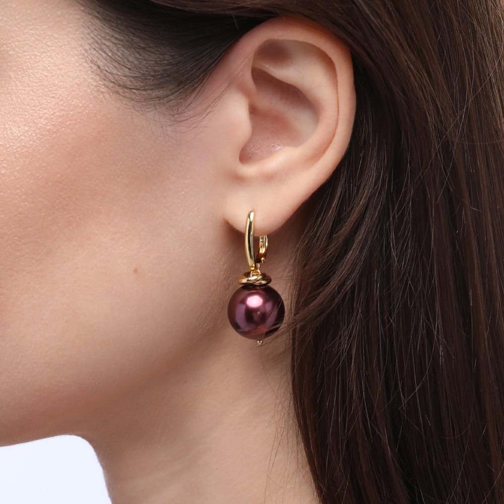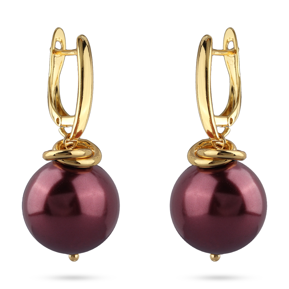 Описание: Изготовлено из ювелирного сплава на основе латуни с гальваническим покрытием золотом. Изделие украшает жемчуг Майорка диаметром 16мм цвета бургунди. Длина серьги 3.5см. Английская застежка.