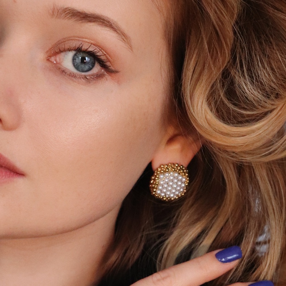 Описание: Изготовлено из ювелирного сплава на основе латуни с гальваническим покрытием золотом. Изделие украшает жемчуг Майорка белого цвета. Размер серьги 2.5х2.5см. Итальянская застежка.