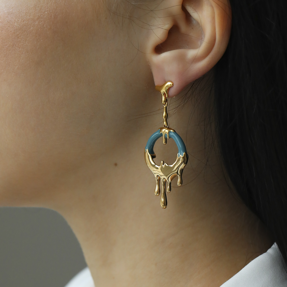 Описание: Изготовлено из ювелирного сплава на основе латуни с гальваническим покрытием золотом. Изделие украшает эмаль изумрудного цвета. Размер серьги 5.5х2см. Застежка-гвоздики.