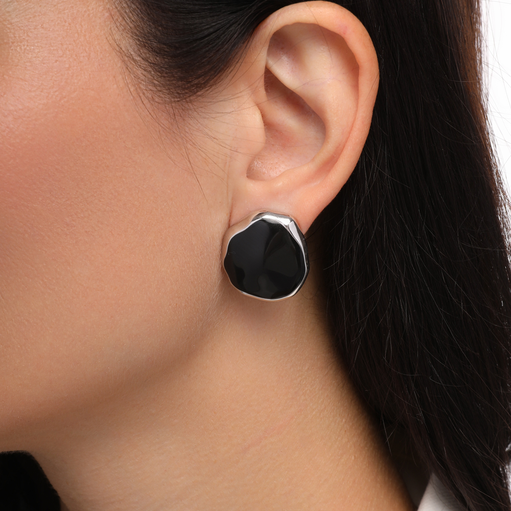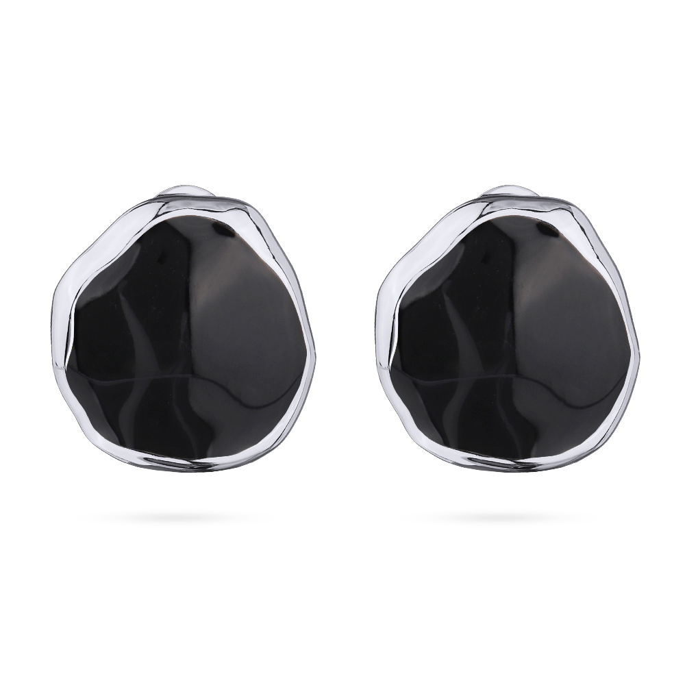 Описание: Изготовлено из ювелирного сплава на основе латуни с гальваническим покрытием родием. Изделие украшает эмаль черного цвета. Размер серьги 2, 5х2, 5см. Французская застежка.