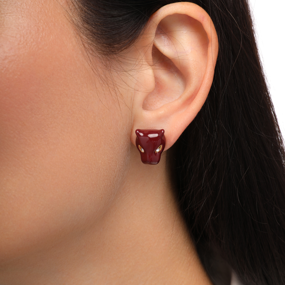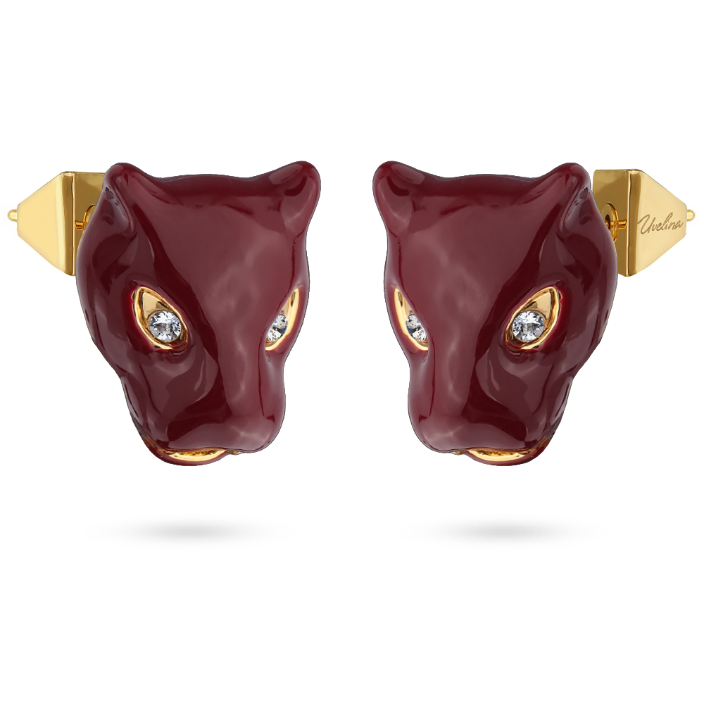 Описание: Изготовлено из ювелирного сплава на основе латуни с гальваническим покрытием золотом. Изделие покрыто эмалью цвета бургунди и украшено белыми кристаллами Сваровски. Размер украшения 1.5х1см. Застежка-гвоздики.