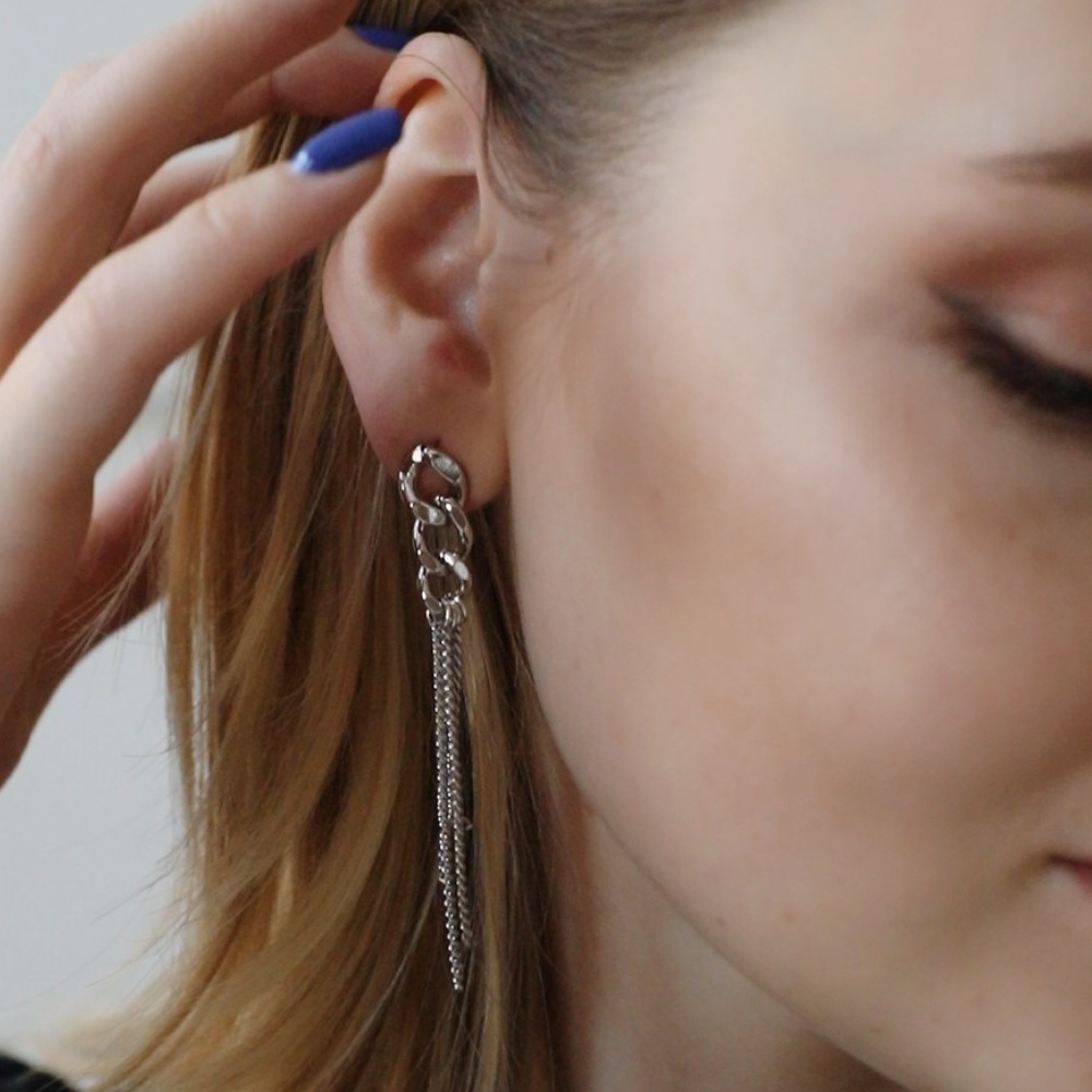 Описание: Изготовлено из ювелирного сплава на основе латуни с гальваническим покрытием родием. Размер серьги 7.5х0.8см. Застежка-гвоздики.