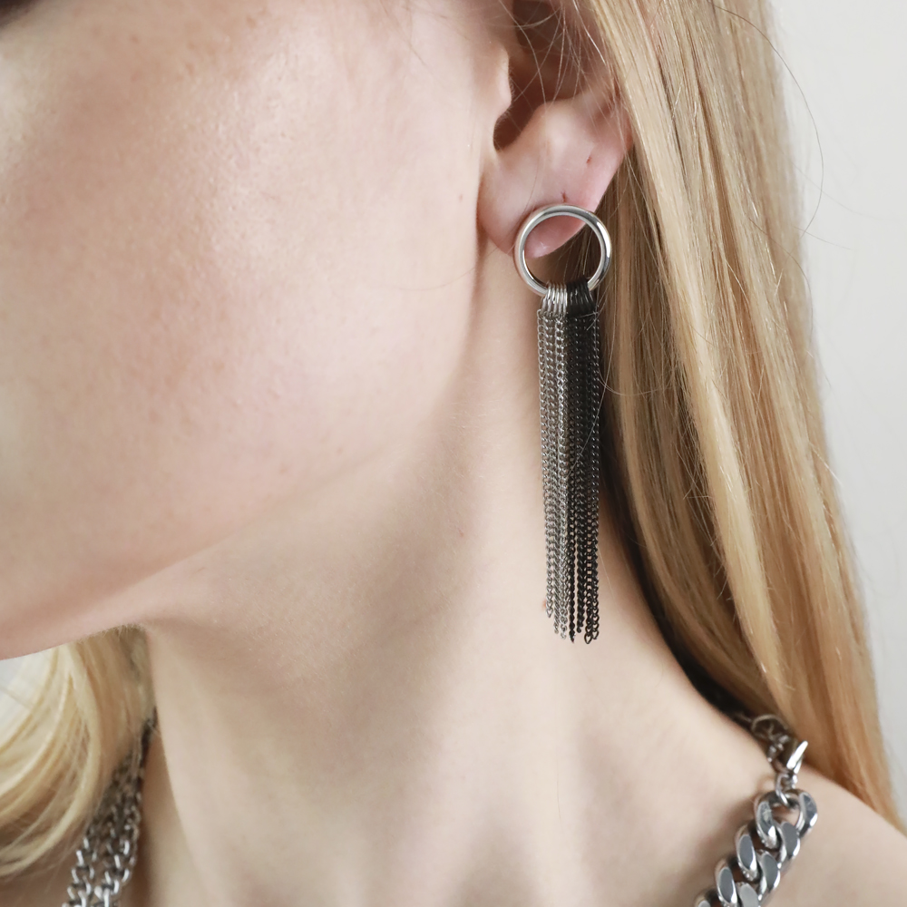 Описание: Изготовлено из ювелирного сплава на основе латуни с гальваническим покрытием родием и черным родием. Размер серьги 7х1.5см. Застежка-гвоздики.