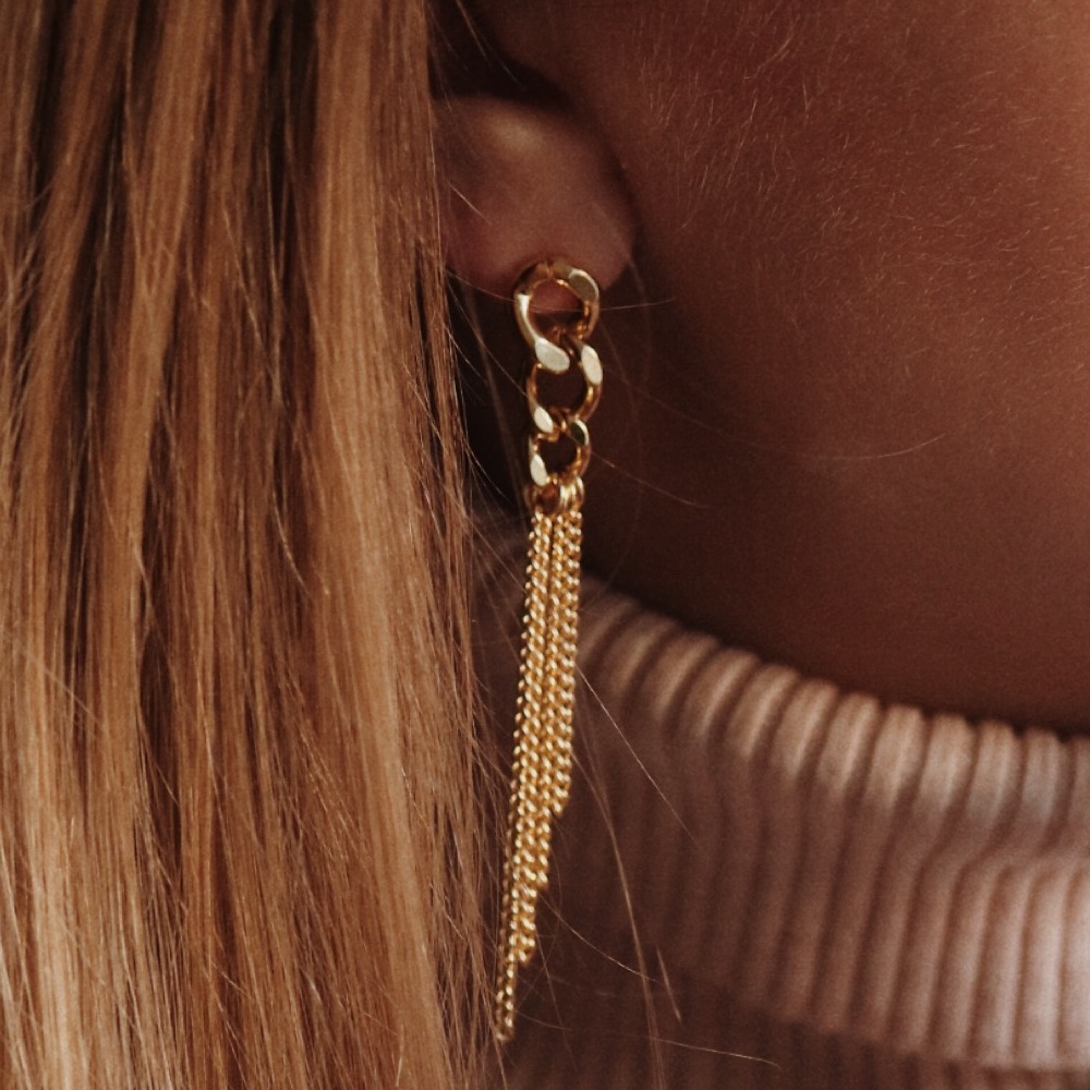 Описание: Изготовлено из ювелирного сплава на основе латуни с гальваническим покрытием золотом. Размер серьги 7.5х0.8см. Застежка-гвоздики.