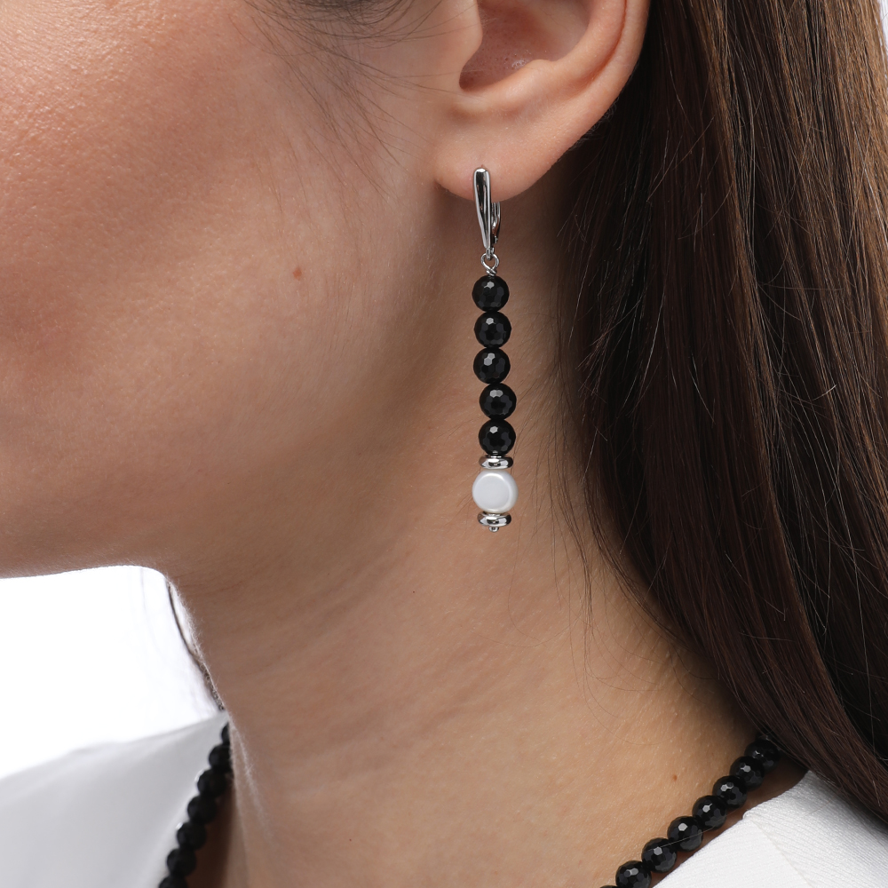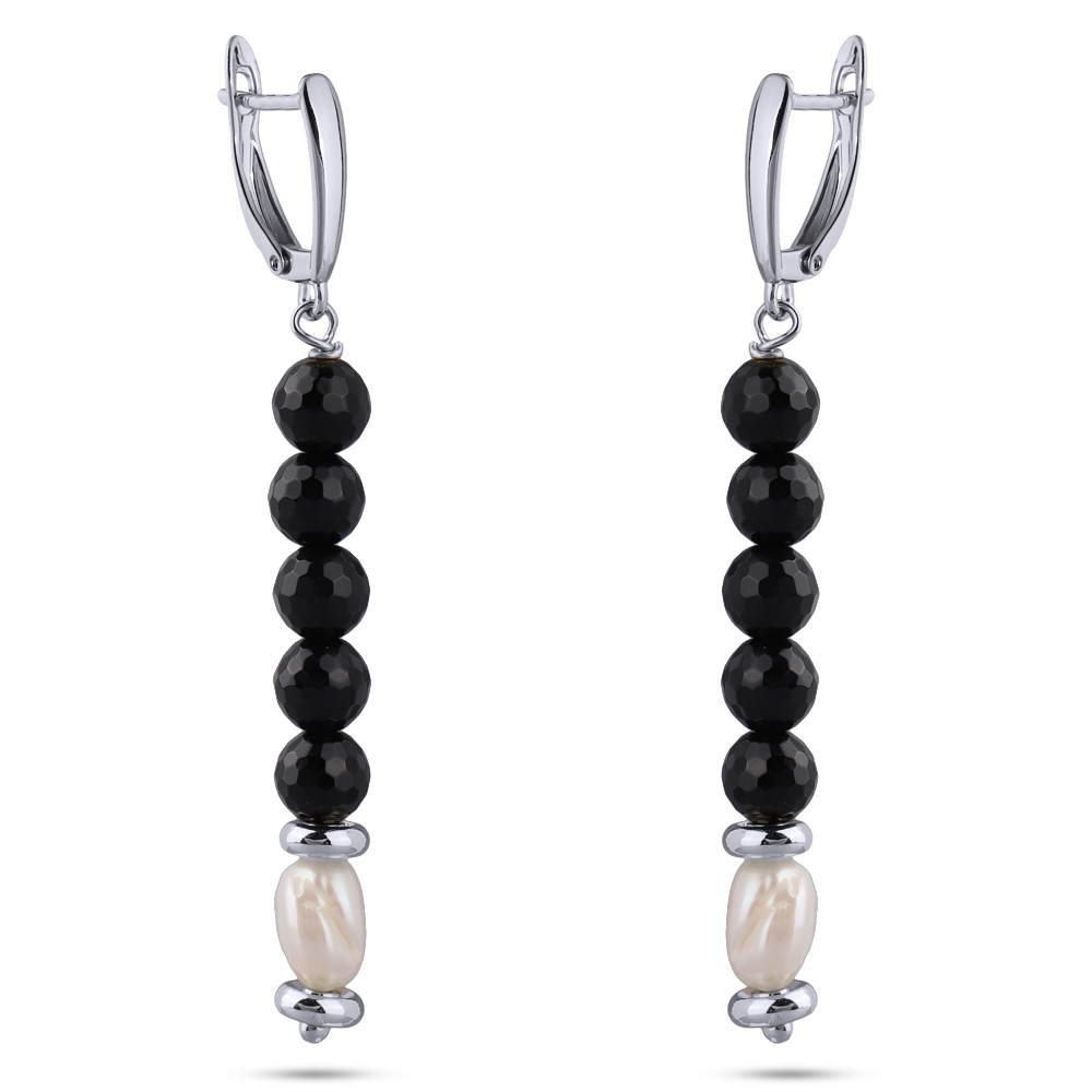 Описание: Изготовлено из ювелирного сплава на основе латуни с гальваническим покрытием родием. Изделие украшают жемчуг белого цвета и черный агат диаметром 6мм. Длина серьги 6см. Английская застежка. *Цвет и форма жемчужин может отличаться от изображенной на фото.