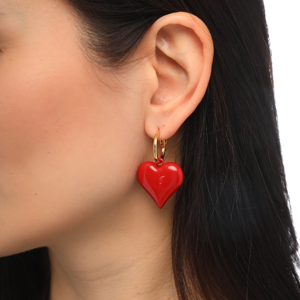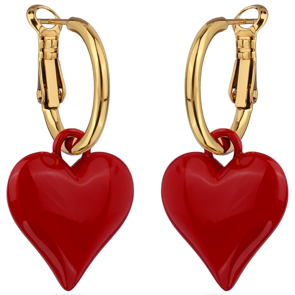 Описание: Изготовлено из ювелирного сплава на основе латуни с гальваническим покрытием золотом. Изделие украшает эмаль красного цвета. Размер серьги 4.3х2.5см. Итальянская застежка.